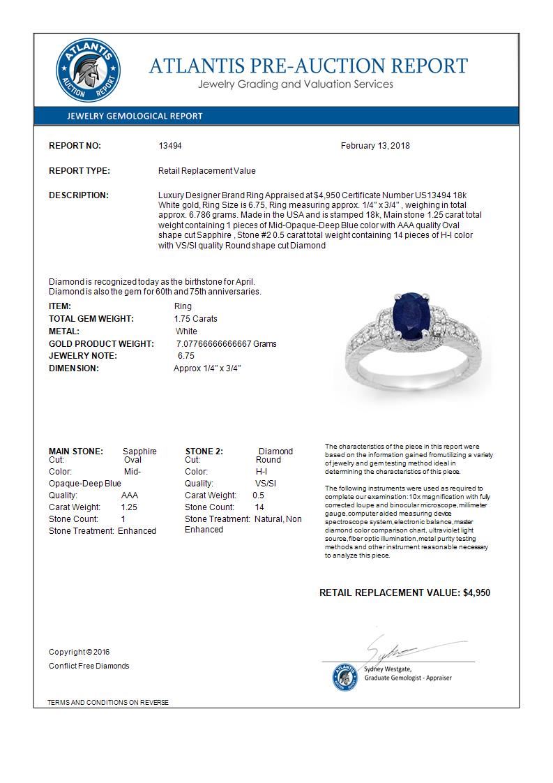 REF-74W9F -13494 ---- 1.75 CTW Blue Sapphire & Diamond Ring 18K White Gold ---- Luxury Designer Brand Ring Appraised at $4,950 Certificate Number US13494 18k White gold, Ring Size is 6.75, Ring measuring approx. 1/4" x 3/4" , weighing in total approx. 6.786 grams. Made in the USA and is stamped 18k, Main stone 1.25 carat total weight containing 1 pieces of Mid-Opaque-Deep Blue color with AAA quality Oval shape cut Sapphire , Stone #2 0.5 carat total weight containing 14 pieces of H-I color with VS/SI quality Round shape cut Diamond