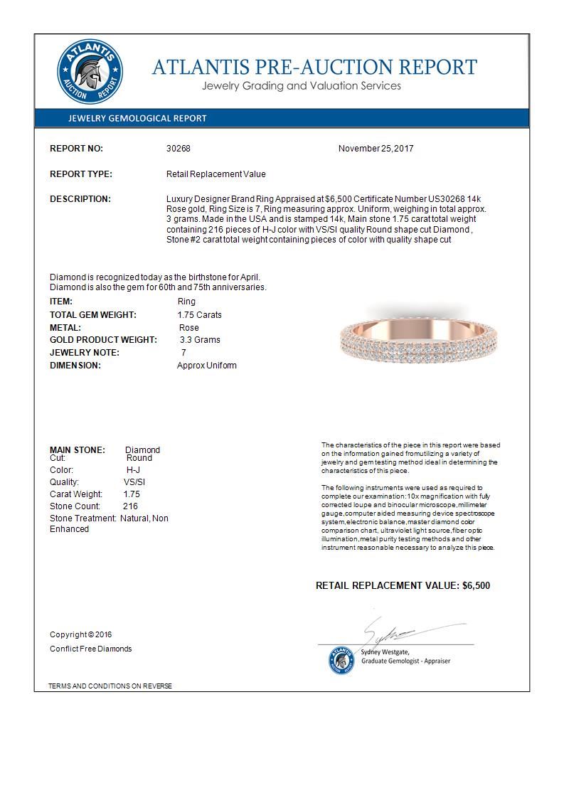 REF-130T9M -30268 ---- 1.75 CTW Certified VS/SI Diamond Micro Eternity Ring 14K Rose Gold ---- Luxury Designer Brand Ring Appraised at $6,500 Certificate Number US30268  14k Rose gold,  Ring Size is 7, Ring measuring approx. Uniform, weighing in total approx. 3 grams. Made in the USA and is stamped 14k, Main stone 1.75 carat total weight containing 216 pieces of H-J color with VS/SI quality Round shape cut Diamond , Stone #2  carat total weight containing  pieces of  color with quality  shape cut