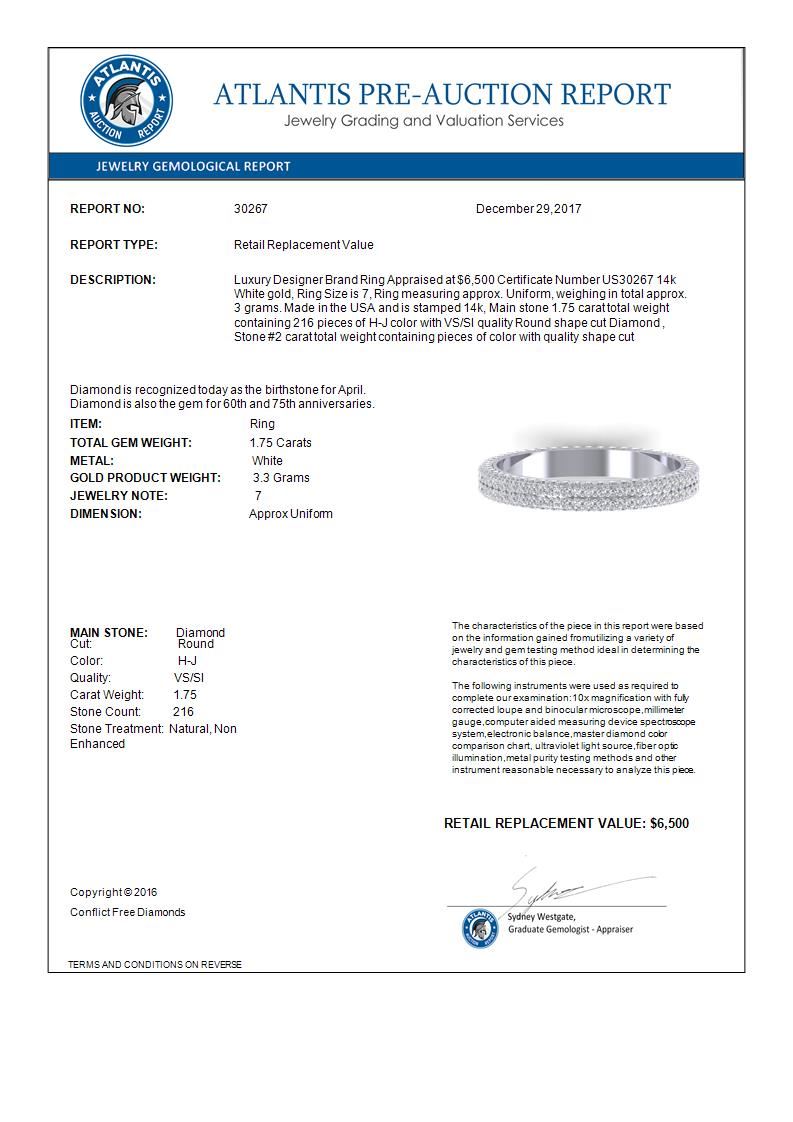 REF-130W9F -30267 ---- 1.75 CTW Certified VS/SI Diamond Micro Eternity Ring 14K White Gold ---- Luxury Designer Brand Ring Appraised at $6,500 Certificate Number US30267 14k White gold, Ring Size is 7, Ring measuring approx. Uniform, weighing in total approx. 3 grams. Made in the USA and is stamped 14k, Main stone 1.75 carat total weight containing 216 pieces of H-J color with VS/SI quality Round shape cut Diamond , Stone #2 carat total weight containing pieces of color with quality shape cut