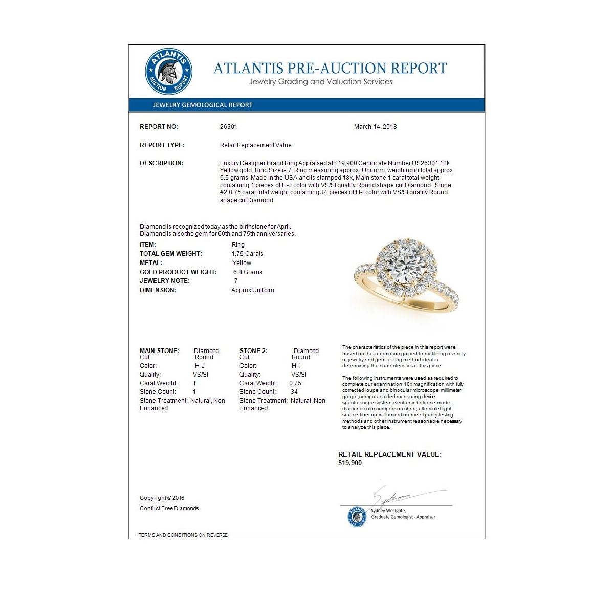 REF-402W2F -26301 ---- 1.75 CTW Certified VS/SI Diamond Solitaire Halo Ring 18K Yellow Gold ---- Luxury Designer Brand Ring Appraised at $19,900 Certificate Number US26301 18k Yellow gold, Ring Size is 7, Ring measuring approx. Uniform, weighing in total approx. 6.5 grams. Made in the USA and is stamped 18k, Main stone 1 carat total weight containing 1 pieces of H-J color with VS/SI quality Round shape cut Diamond , Stone #2 0.75 carat total weight containing 34 pieces of H-I color with VS/SI quality Round shape cut Diamond