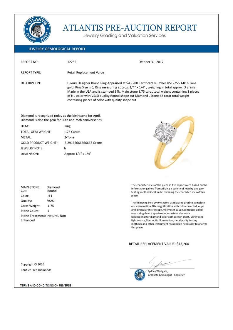 REF-809H8A -12255 ---- 1.75 CTW Certified VS/SI Diamond Solitaire Ring 14K 2-Tone Gold ---- Luxury Designer Brand Ring Appraised at $43,200 Certificate Number US12255 14k 2-Tone gold, Ring Size is 6, Ring measuring approx. 1/4" x 1/4" , weighing in total approx. 3 grams. Made in the USA and is stamped 14k, Main stone 1.75 carat total weight containing 1 pieces of H-J color with VS/SI quality Round shape cut Diamond , Stone #2 carat total weight containing pieces of color with quality shape cut
