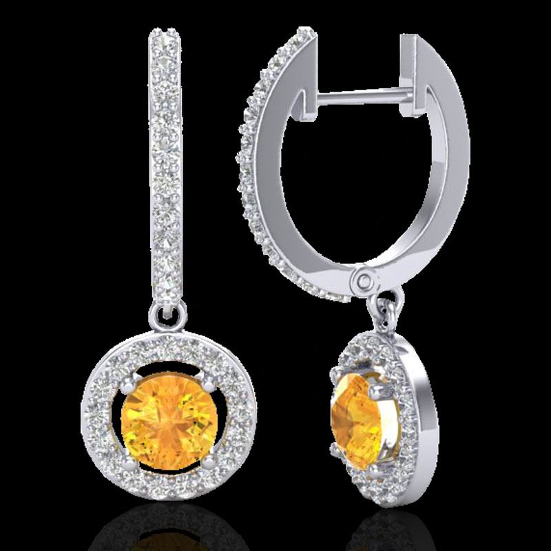 REF-82A8X -23248 ---- 1.75 CTW Citrine & Micro Pave Halo VS/SI Diamond Earrings 18K White Gold ---- Luxury Designer Brand Earring Appraised at $5,450 Certificate Number US23248 18k White gold, Earring Size is 1 Inches, Earring measuring approx. 1" X 3/8" , weighing in total approx. 5 grams. Made in the USA and is stamped 18k, Main stone 1.06 carat total weight containing 2 pieces of Translucent Yellow color with AAA quality Round shape cut Citrine , Stone #2 0.69 carat total weight containing 48 pieces of H-I color with VS/SI quality Round shape cut Diamond