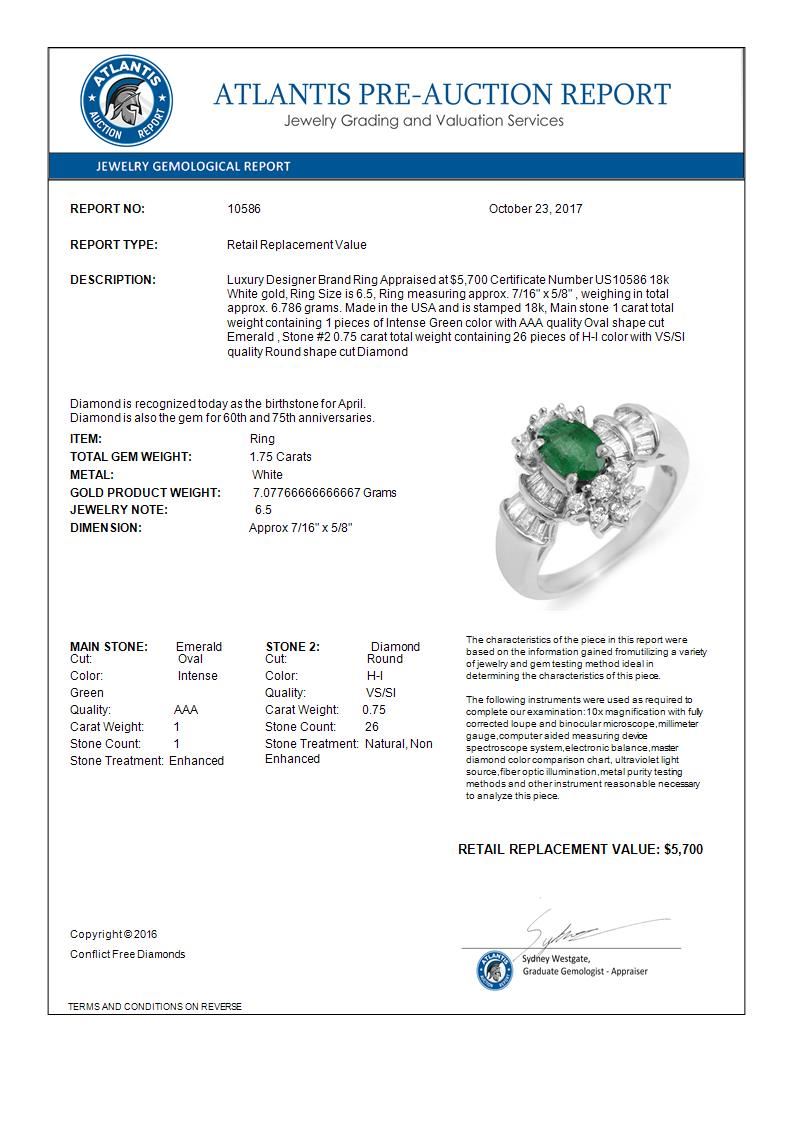 10586 - REF-86M7F ---- 1.75 CTW Emerald & Diamond Ring 18K White Gold ---- Luxury Designer Brand Ring Appraised at $5,700 Certificate Number US10586 18k White gold, Ring Size is 6.5, Ring measuring approx. 7/16" x 5/8" , weighing in total approx. 6.786 grams. Made in the USA and is stamped 18k, Main stone 1 carat total weight containing 1 pieces of Intense Green color with AAA quality Oval shape cut Emerald , Stone #2 0.75 carat total weight containing 26 pieces of H-I color with VS/SI quality Round shape cut Diamond