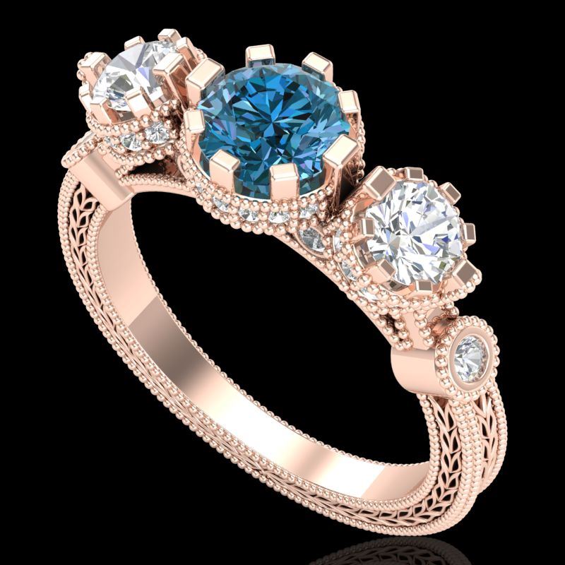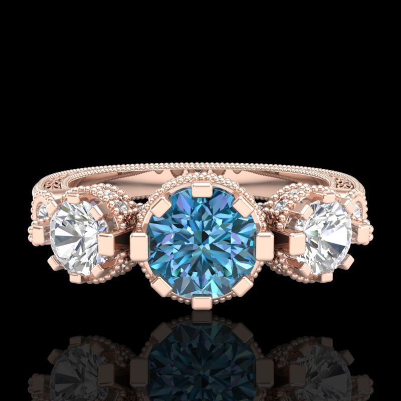 1.75 CTW Intense Blue Diamond Solitaire Art Deco 3 Stone Ring 18K Rose Gold ---- Luxury Designer Brand 3 stone ring Appraised Retail Price at $15,000 ---- SKU Number US37881 18k Rose gold 3 stone ring Size is 7, 3 stone ring measuring approx. Uniform, weighing in total approx. 6.7 grams. Made in the USA and is stamped 18k, Main stone 0.77 carat total weight containing 1 pieces of Intense Fancy Blue color with SI quality Round shape cut Diamond , Stone #2 0.53 carat total weight containing 2 pieces of H-I color with VS/SI quality Round shape cut