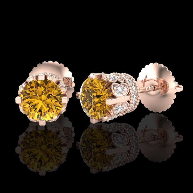 REF-172W8F -37358 ---- 1.75 CTW Intense Fancy Yellow Diamond Art Deco Stud Earrings 18K Rose Gold ---- Luxury Designer Brand Earring Appraised at $11,400 Certificate Number US37358 18k Rose gold, Earring Size is Larger, Earring measuring approx. Uniform, weighing in total approx. 6 grams. Made in the USA and is stamped 18k, Main stone 1.15 carat total weight containing 2 pieces of Intense Fancy Yellow color with SI quality Round shape cut Diamond , Stone #2 0.6 carat total weight containing 60 pieces of H-I color with VS/SI quality Round shape cut Diamond