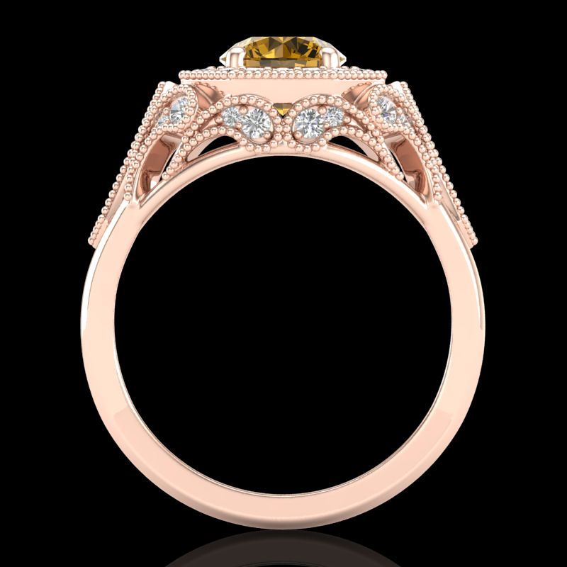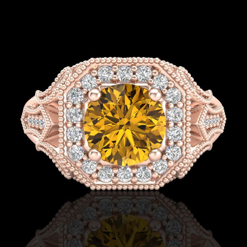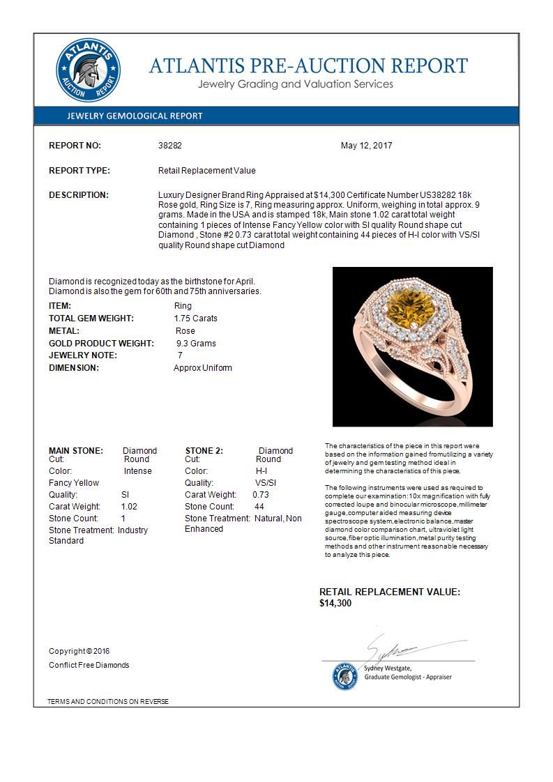 1.75 CTW Intense Fancy Yellow Diamond Engagement Art Deco Ring 18K Rose Gold ---- Luxury Designer Brand Ring Appraised Retail Price at $14,300 ---- SKU Number US38282 18k Rose gold Ring Size is 7, Ring measuring approx. Uniform, weighing in total approx. 9 grams. Made in the USA and is stamped 18k, Main stone 1.02 carat total weight containing 1 pieces of Intense Fancy Yellow color with SI quality Round shape cut Diamond , Stone #2 0.73 carat total weight containing 44 pieces of H-I color with VS/SI quality Round shape cut
