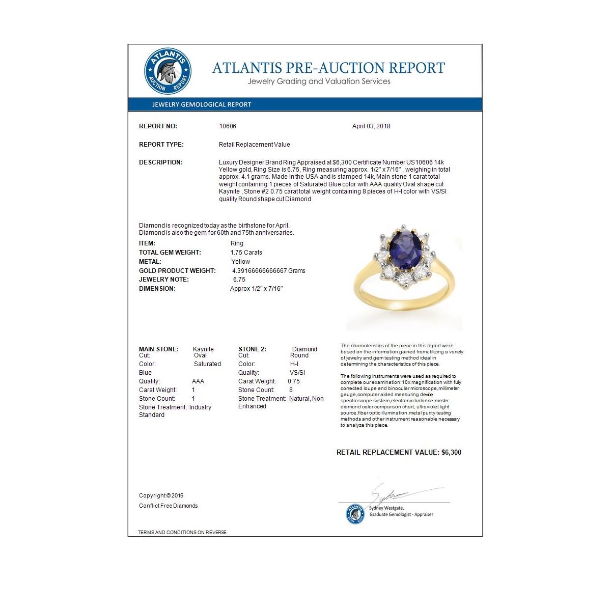 REF-95A8X -10606 ---- 1.75 CTW Kaynite & Diamond Ring 14K Yellow Gold ---- Luxury Designer Brand Ring Appraised at $6,300 Certificate Number US10606 14k Yellow gold, Ring Size is 6.75, Ring measuring approx. 1/2" x 7/16" , weighing in total approx. 4.1 grams. Made in the USA and is stamped 14k, Main stone 1 carat total weight containing 1 pieces of Saturated Blue color with AAA quality Oval shape cut Kaynite , Stone #2 0.75 carat total weight containing 8 pieces of H-I color with VS/SI quality Round shape cut Diamond