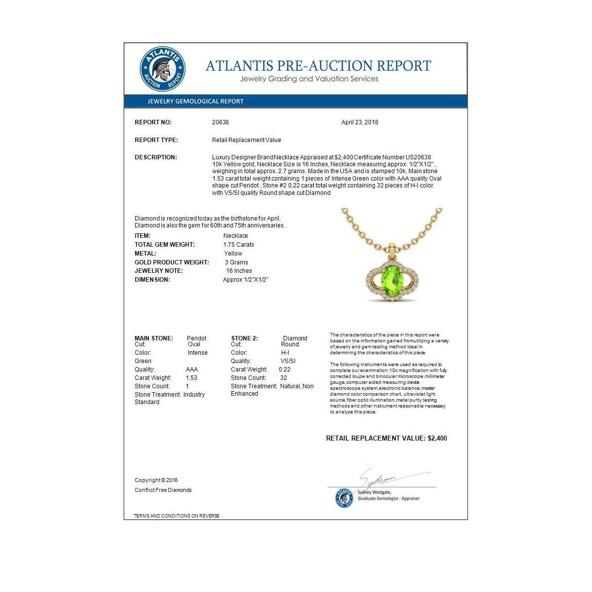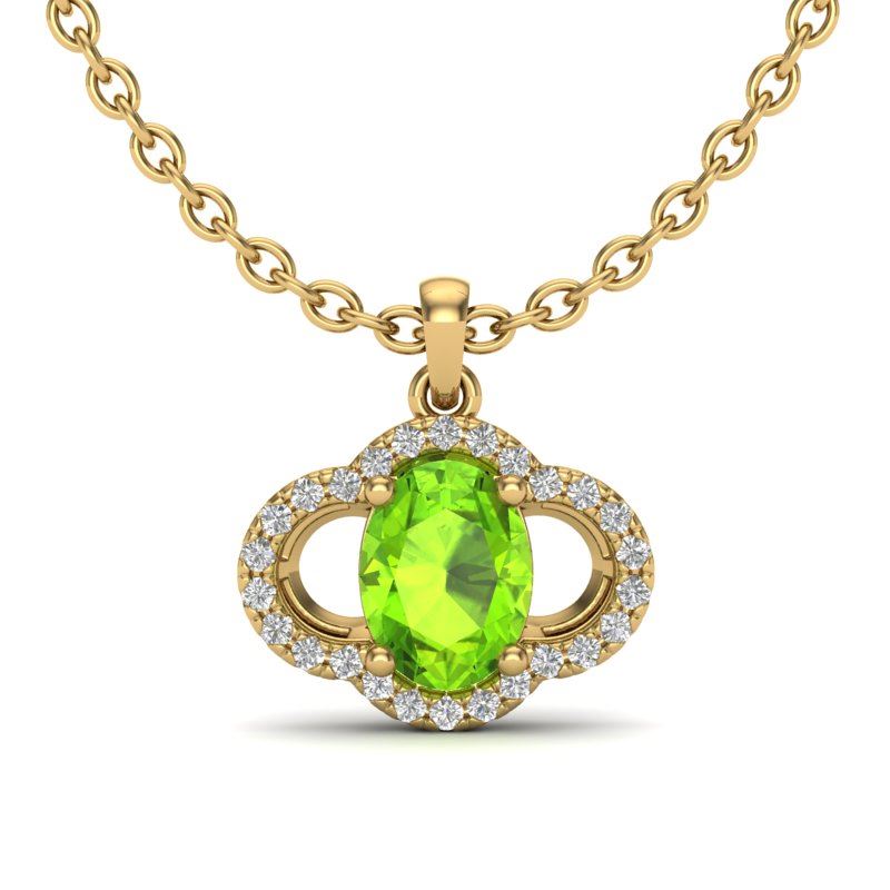 REF-33T5M -20638 ---- 1.75 CTW Peridot & Micro Pave VS/SI Diamond Necklace 10K Yellow Gold ---- Luxury Designer Brand Necklace Appraised at $2,400 Certificate Number US20638 10k Yellow gold, Necklace Size is 16 Inches, Necklace measuring approx. 1/2"X1/2" , weighing in total approx. 2.7 grams. Made in the USA and is stamped 10k, Main stone 1.53 carat total weight containing 1 pieces of Intense Green color with AAA quality Oval shape cut Peridot , Stone #2 0.22 carat total weight containing 32 pieces of H-I color with VS/SI quality Round shape cut Diamond