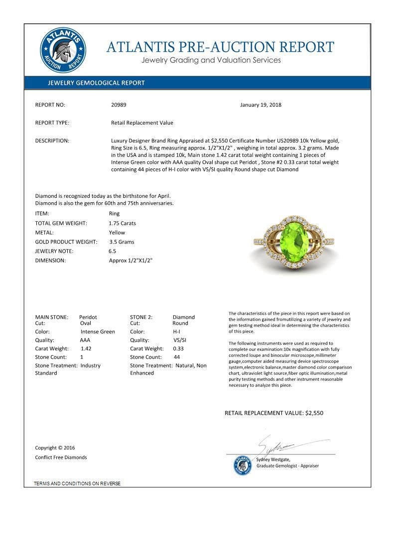 REF-35T8M -20989 ---- 1.75 CTW Peridot & Micro Pave VS/SI Diamond Ring 10K Yellow Gold ---- Luxury Designer Brand Ring Appraised at $2,550 Certificate Number US20989 10k Yellow gold, Ring Size is 6.5, Ring measuring approx. 1/2"X1/2" , weighing in total approx. 3.2 grams. Made in the USA and is stamped 10k, Main stone 1.42 carat total weight containing 1 pieces of Intense Green color with AAA quality Oval shape cut Peridot , Stone #2 0.33 carat total weight containing 44 pieces of H-I color with VS/SI quality Round shape cut Diamond