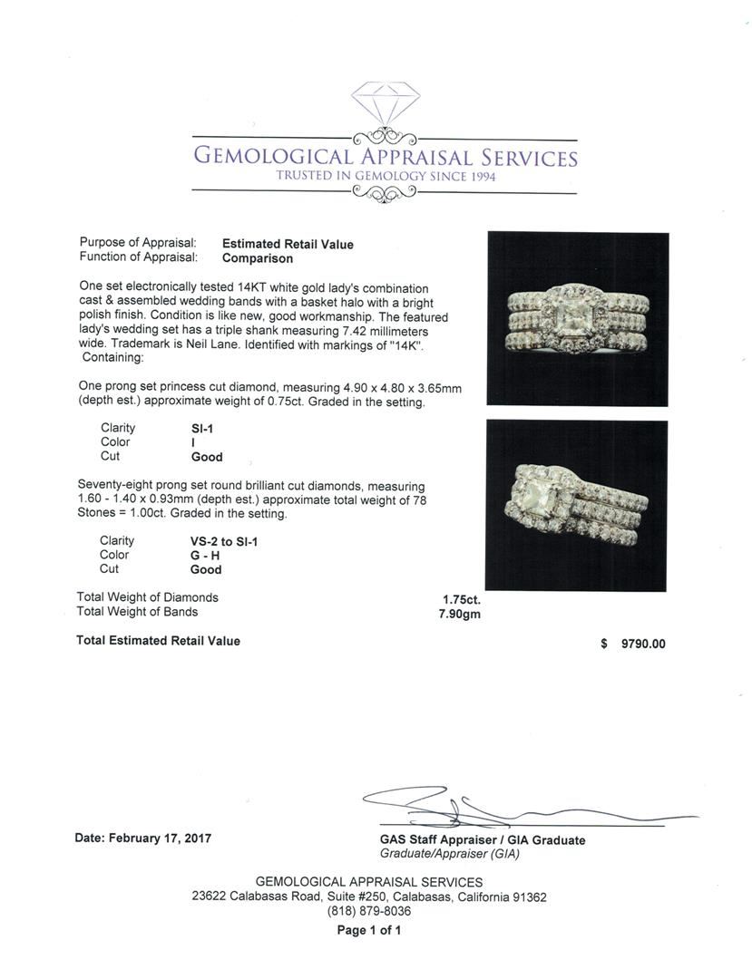 One set electronically tested 14KT white gold lady's combination cast & assembled wedding bands with a basket halo with a bright polish finish. The featured lady's wedding set has a triple shank measuring 7.42 millimeters wide. Trademark is Neil Lane. Identified with markings of '14K'. Condition is like new, good workmanship. Containing: One prong set princess cut diamond, measuring 4.90 x 4.80 x 3.65mm (depth est.) approximate weight of 0.75ct. Graded in the setting. Clarity SI-1. Color: I Cut Good Seventy-Eight prong set round brilliant cut diamonds, measuring 1.60 - 1.40 x 0.93mm (depth est.) approximate total weight of 78 Stones = 1.00ct. Graded in the setting. Clarity VS-2 to SI-1. Color: G - H Cut Good. Total Weight of Diamonds 1.75ct.. Total Weight of Bands 7.90gm. GAS Appraised at $9,790.00.