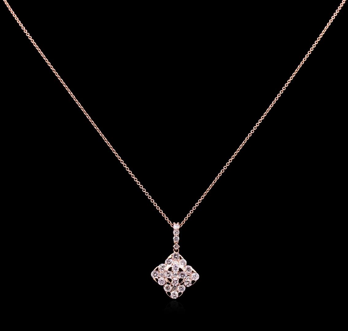 One electronically tested 14KT rose gold ladies cast & assembled diamond pendant and chain. The pendant features a square gallery of round brilliant diamonds completed by an elaborate under gallery and a diamond set bail. The pendant is supported an eighteen inch length 14KT rose gold designer style chain, terminating in a spring ring clasp. Bright polish finish. Identified with markings of "K14". Condition is new, good workmanship. Containing: Twenty-Five prong set round brilliant cut diamonds, measuring 2.90 - 2.00 x 1.47mm exact total weight 25 Stones = 1.75ct. Graded in the setting. Clarity: SI-2 to I-1. Color: G - H. Total Weight of Diamonds 1.75ct. Total Weight of Pendant And Chain 5.96gm. AIG Appraised at $6,005.00.