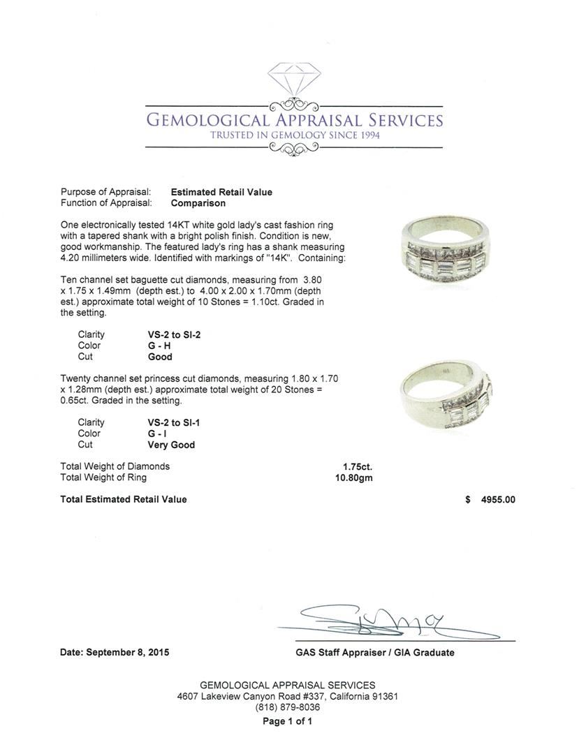 One electronically tested 14KT white gold lady's cast fashion ring with a tapered shank with a bright polish finish. The featured lady's ring has a shank measuring 4.20 millimeters wide. Identified with markings of "14K". Condition is new, good workmanship. Containing: Ten channel set baguette cut diamonds, measuring from 3.80 x 1.75 x 1.49mm (depth est.) to 4.00 x 2.00 x 1.70mm (depth est.) approximate total weight of 10 Stones = 1.10ct. Graded in the setting. Clarity: VS-2 to SI-2. Color: G - H. Cut Good Twenty channel set princess cut diamonds, measuring 1.80 x 1.70 x 1.28mm (depth est.) approximate total weight of 20 Stones = 0.65ct. Graded in the setting. Clarity: VS-2 to SI-1. Color: G - I. Cut Very Good. Total Weight of Diamonds 1.75ct. Total Weight of Ring 10.80gm. GAS Appraised at $4,955.00.