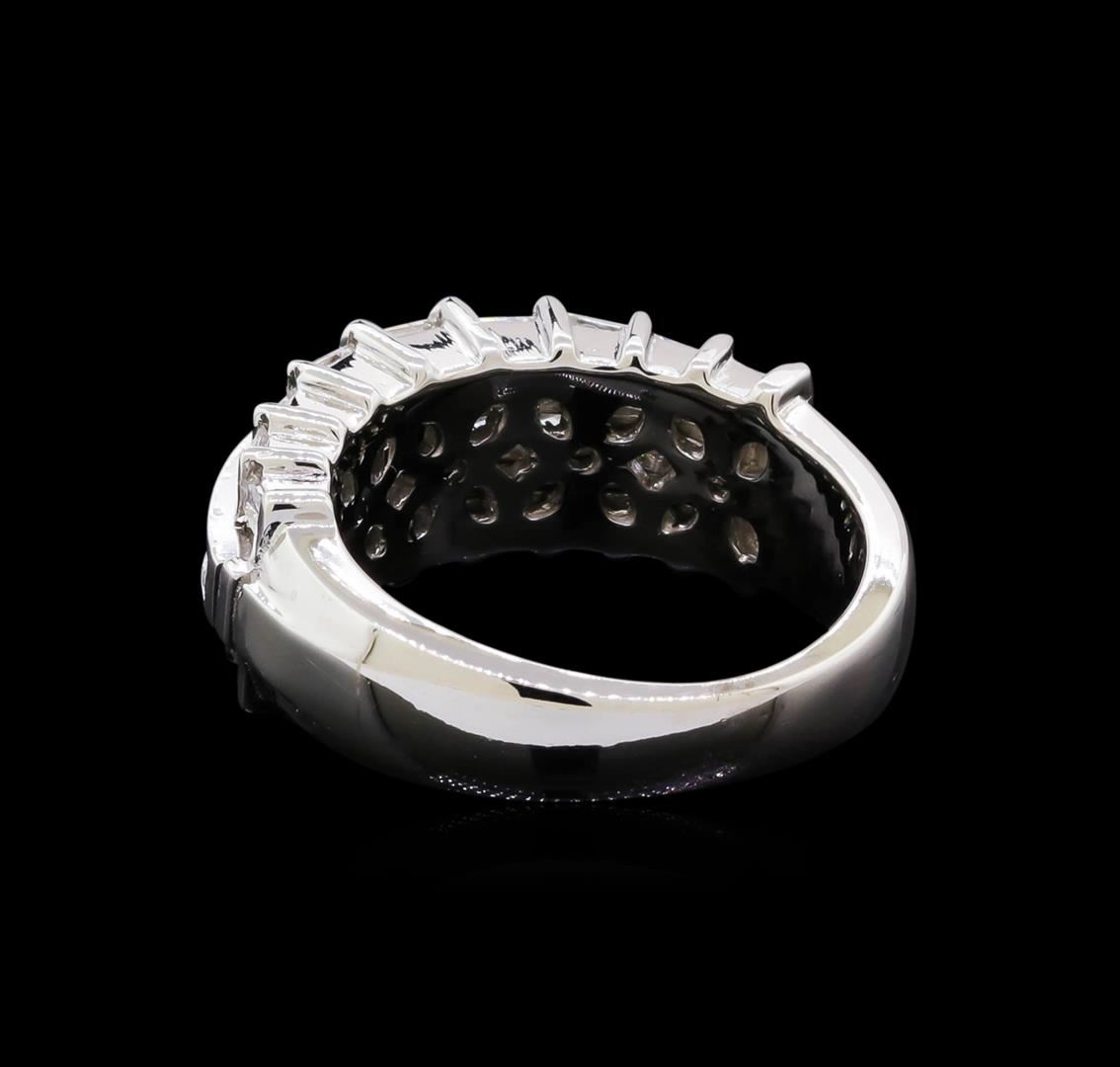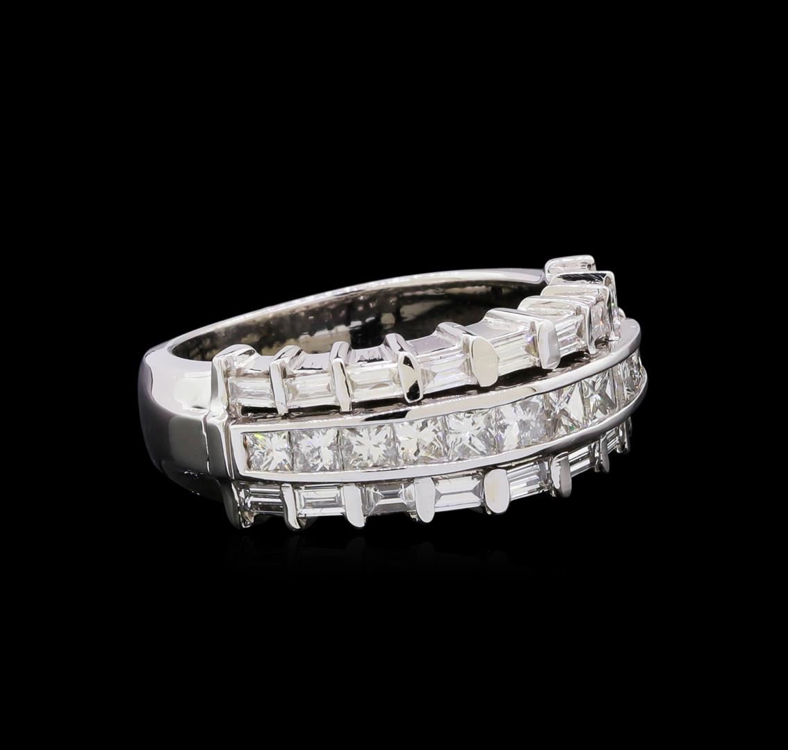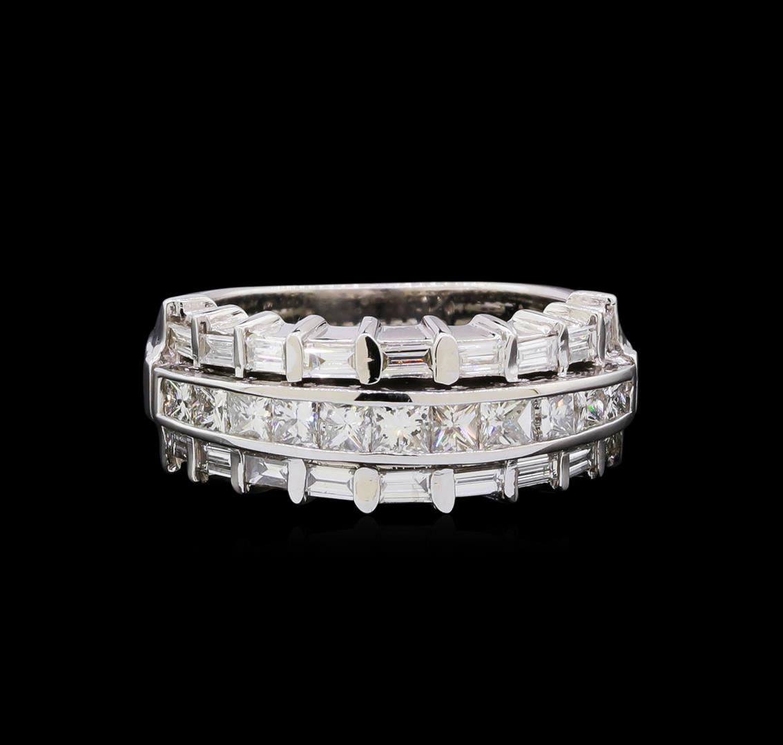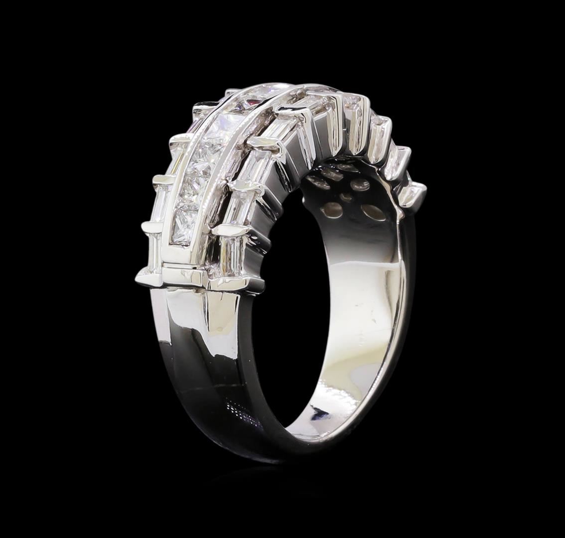 One electronically tested 14KT white gold lady's cast wedding ring with a three row tapered shank with a bright polish finish. The featured lady's ring has a shank measuring 3.90 millimeters wide. Identified with markings of "14K". Condition is new, good workmanship. Containing: Eighteen channel set baguette cut diamonds, measuring from 2.80 x 1.40 x 1.19mm (depth est.) to 2.90 x 1.45 x 1.23mm (depth est.) approximate total weight of 18 Stones = 0.80ct. Graded in the setting. Clarity: VS-1 to VS-2. Color: F - Very Good Eleven channel set princess cut diamonds, measuring 2.70 x 2.35 x 1.65mm (depth est.) approximate total weight of 11 Stones = 0.95ct. Graded in the setting. Clarity: VS-2 to SI-2. Color: G - I. Cut Very Good. Total Weight of Diamonds 1.75ct. Total Weight of Ring 10.50gm GAS Appraised at $6,385.00.