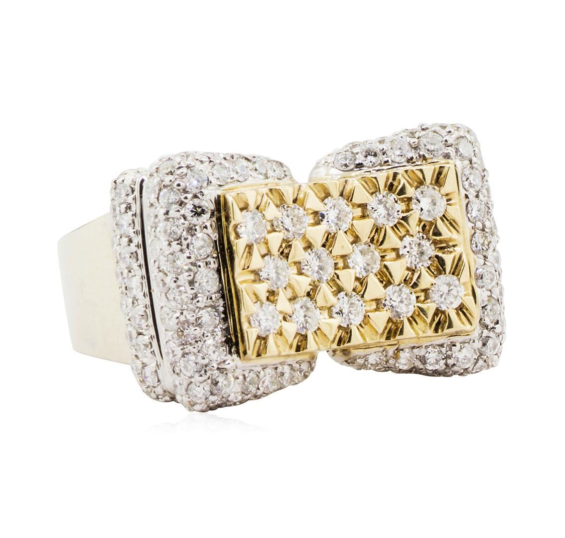 One electronically tested 14KT white and yellow gold lady's combination cast & assembled fashion ring with a bow motif with a bright polish finish. Condition is like new, good workmanship. The featured lady's ring has a shank measuring 5.00 millimeters wide. Trademark is Ciemme. Identified with markings of "14K". Containing: Fourteen prong set round brilliant cut diamonds, measuring 2.20 - 2.10 x 1.33mm (depth est.) approximate total weight of 14 Stones = 0.53ct. Graded in the setting. Color Clarity Cut G - H SI-1 to SI-2 Good One hundred sixteen bead set round brilliant cut diamonds, measuring 1.50 - 1.35 x 0.89mm (depth est.) approximate total weight of 116 Stones = 1.22ct. Graded in the setting. Color Clarity Cut G - H SI-1 to SI-2 Good Total Weight of Diamonds Total Weight of Ring Total Estimated Retail Value 1.75ct. 10.20gm S 6980.00