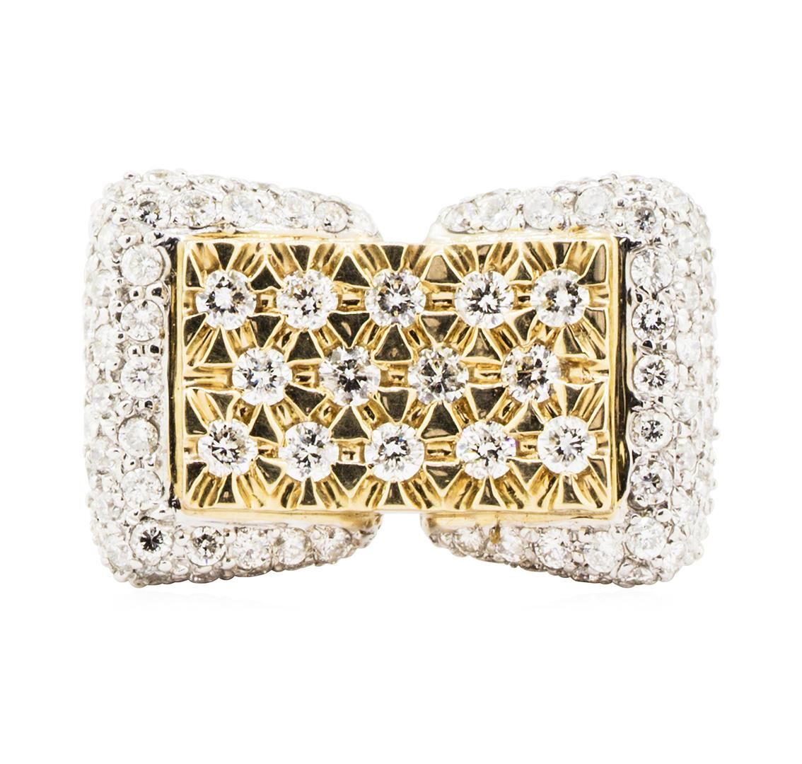 One electronically tested 14KT white and yellow gold lady's combination cast & assembled fashion ring with a bow motif with a bright polish finish. Condition is like new, good workmanship. The featured lady's ring has a shank measuring 5.00 millimeters wide. Trademark is Ciemme. Identified with markings of "14K". Containing: Fourteen prong set round brilliant cut diamonds, measuring 2.20 - 2.10 x 1.33mm (depth est.) approximate total weight of 14 Stones = 0.53ct. Graded in the setting. Color Clarity Cut G - H SI-1 to SI-2 Good One hundred sixteen bead set round brilliant cut diamonds, measuring 1.50 - 1.35 x 0.89mm (depth est.) approximate total weight of 116 Stones = 1.22ct. Graded in the setting. Color Clarity Cut G - H SI-1 to SI-2 Good Total Weight of Diamonds Total Weight of Ring Total Estimated Retail Value 1.75ct. 10.20gm S 6980.00