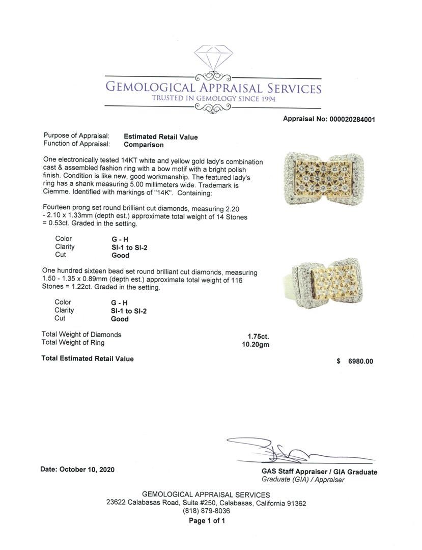 One electronically tested 14KT white and yellow gold lady's combination cast & assembled fashion ring with a bow motif with a bright polish finish. Condition is like new, good workmanship. The featured lady's ring has a shank measuring 5.00 millimeters wide. Trademark is Ciemme. Identified with markings of "14K". Containing: Fourteen prong set round brilliant cut diamonds, measuring 2.20 - 2.10 x 1.33mm (depth est.) approximate total weight of 14 Stones = 0.53ct. Graded in the setting. Color Clarity Cut G - H SI-1 to SI-2 Good One hundred sixteen bead set round brilliant cut diamonds, measuring 1.50 - 1.35 x 0.89mm (depth est.) approximate total weight of 116 Stones = 1.22ct. Graded in the setting. Color Clarity Cut G - H SI-1 to SI-2 Good Total Weight of Diamonds Total Weight of Ring Total Estimated Retail Value 1.75ct. 10.20gm S 6980.00