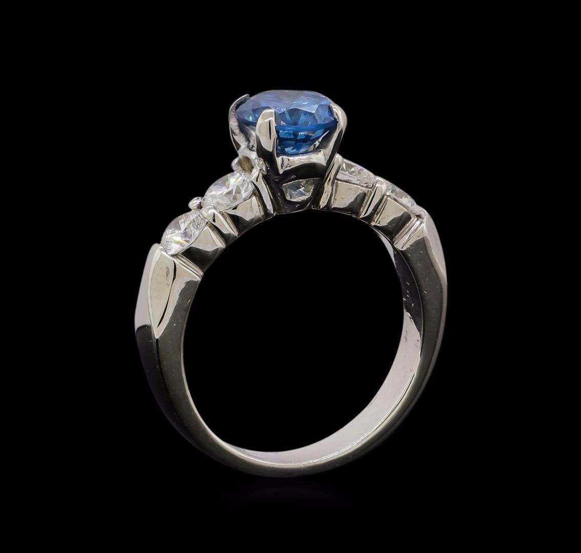 One electronically tested platinum ladies cast diamond ring with a bright polish finish. The featured diamond is set between two diamonds on either side, completed by a two and one-half millimeter wide band. Identified with markings of 'PLAT'. Condition is new, good workmanship. Containing: One prong set round brilliant cut diamond, measuring 6.50 - 6.50 x 3.90mm (depth est.), 3.00.%. GTCF approximate weight of 1.04ct. Graded in the setting. Clarity I-1. Depth: 60.0%. Table: 67.7%. Four prong set round brilliant cut diamonds, measuring 3.70 - 3.60 x 2.19mm (depth est.) approximate total weight of 4 Stones = 0.71ct. Graded in the setting. Clarity VS-1 to VS-2. Color: G - H. Total Weight of Diamonds 1.75ct.. Total Weight of Ring 7.28gm. AIG Appraised at $12,695.00.