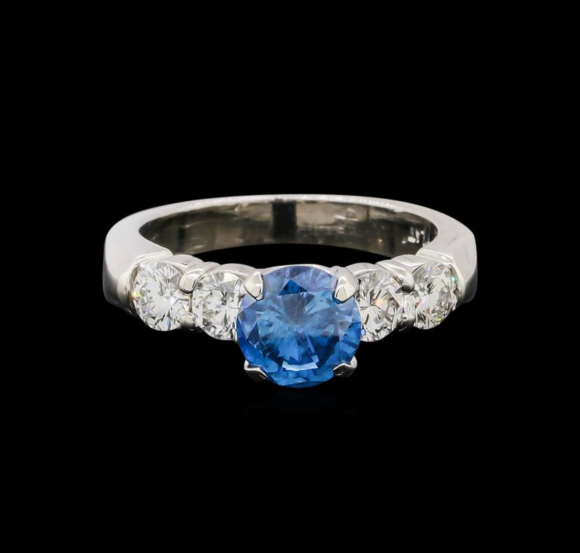 One electronically tested platinum ladies cast diamond ring with a bright polish finish. The featured diamond is set between two diamonds on either side, completed by a two and one-half millimeter wide band. Identified with markings of 'PLAT'. Condition is new, good workmanship. Containing: One prong set round brilliant cut diamond, measuring 6.50 - 6.50 x 3.90mm (depth est.), 3.00.%. GTCF approximate weight of 1.04ct. Graded in the setting. Clarity I-1. Depth: 60.0%. Table: 67.7%. Four prong set round brilliant cut diamonds, measuring 3.70 - 3.60 x 2.19mm (depth est.) approximate total weight of 4 Stones = 0.71ct. Graded in the setting. Clarity VS-1 to VS-2. Color: G - H. Total Weight of Diamonds 1.75ct.. Total Weight of Ring 7.28gm. AIG Appraised at $12,695.00.