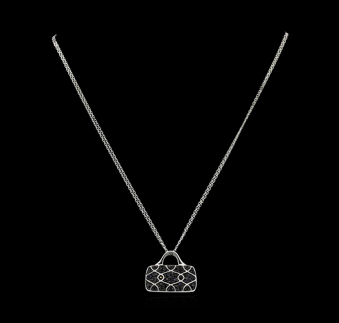 One electronically tested 18KT white gold ladies cast & assembled sapphire and diamond pendant with chain. Condition is good. The Mirabelle handbag pendant features a fashionable purse with a sapphire design on the front and a single diamond above the trademark on the back. The purse's handle also serves as a concealed bail. Measures one inch wide. The pendant is supported by an eighteen inch length 18KT white gold double strand chain, terminating in a lobster claw clasp. Bright and an anodized patterned finish. Trademark is M. Identified with markings of 18K. Containing: Forty-one prng set round mixed cut natural blue sapphires, measuring 2.10 - 1.80 x 1.27mm, approximate total weight of 1.75ct., clarity is heavily included, type II, very dark, very slightly grayish, blue color, (GIA B 8/3), cut is good. Transmitting light somewhat diffusely, translucent to opaque. Naturally occurring internal & external characteristics are present. Color grade is an average for the group. Graded in the setting. One bezel set round brilliant cut diamond, measuring 1.20 - 1.20 x 0.72mm (depth est.) approximate weight of 0.01ct. Graded in the setting. Color: SI-2. Color: H. Total Weight of Colored Stones 1.75ct. Total Weight of Diamonds 0.01ct. Total Weight of Pendant With Chain 11.71 grams. AIG Appraised.
