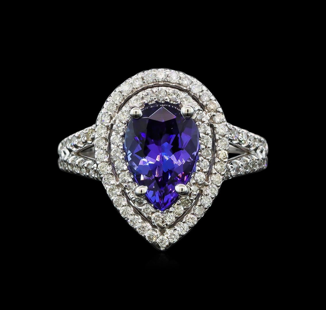 One electronically tested 14KT white gold lady's cast fashion ring with a split shank double halo with a bright polish finish. The featured lady's ring has a double shank measuring 5.27 millimeters wide. Identified with markings of '14K'. Condition is new, good workmanship. Containing: One prong set pear modified brilliant cut natural tanzanite, measuring 9.90 x 6.94 x 3.82mm, (depth est.) approximate weight of 1.75ct., clarity is eye clean, medium dark, moderately strong, violetish blue color, (GIA vB 6/4), cut is very good. Transmitting light with no distortion, transparent. Colored gemstones are presumed to have been subjected to commonly used enhancement processes. Graded in the setting. Thirty-Two prong set round brilliant cut diamonds, measuring 1.30 - 1.25 x 0.79mm (depth est.) approximate total weight of 32 Stones = 0.25ct. Graded in the setting. Clarity SI-1 to I-1. Color: G - I Cut Good Sixty-Two prong set round brilliant cut diamonds, measuring 1.20 - 1.10 x 0.71mm (depth est.) approximate total weight of 62 Stones = 0.36ct. Graded in the setting. Clarity SI-1 to I-1. Color: G - I Cut Good. Total Weight of Colored Stones 1.75ct.. Total Weight of Diamonds 0.61ct.. Total Weight of Ring 5.80gm. GAS Appraised at $5,620.00.