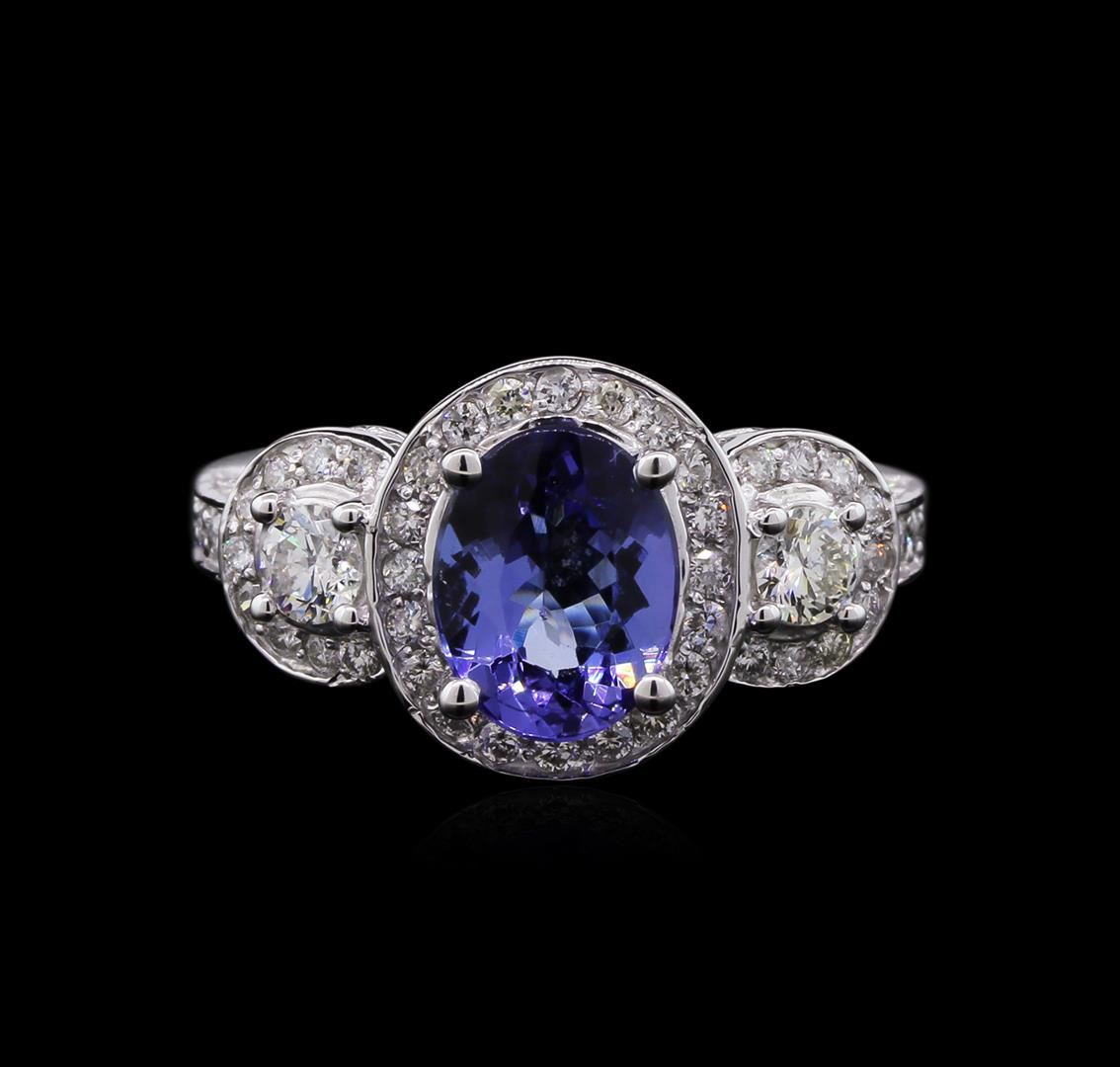 One electronically tested 14KT white gold lady's cast 3-stone halo ring with a bright polish finish. The featured lady's ring has a shank measuring 2.06 millimeters in width. Identified with markings of "14K". Condition is new, good workmanship. Containing: One prong set oval modified brilliant cut natural tanzanite, measuring 9.20 x 7.11 x 3.90mm, approximate weight of 1.75ct., clarity is eye clean, type I, medium light, moderately strong, bluish violet color, (GIA bV 4/4), cut is good. Transmitting light with no distortion, transparent. Colored gemstones are presumed to have been subjected to commonly used enhancement processes. Graded in the setting. Two prong set round brilliant cut diamonds, measuring 3.50 - 3.46 x 2.09mm (depth est.) approximate total weight of 2 Stones = 0.30ct. Graded in the setting. Clarity: SI-2. Color: I - Good Forty-Four prong set round brilliant cut diamonds, measuring 1.40 - 1.35 x 0.90mm (depth est.) approximate total weight of 44 Stones = 0.47ct. Graded in the setting. Clarity: SI-2 to I-1. Color: H - I. Cut Good Twenty-Eight prong set round brilliant cut diamonds, measuring 1.30 - 1.20 x 0.75mm (depth est.) approximate total weight of 28 Stones = 0.20ct. Graded in the setting. Clarity: SI-2 to I-1. Color: H - I. Cut Good. Total Weight of Colored Stones 1.75ct. Total Weight of Diamonds 0.97ct. Total Weight of Ring 5.50gm. GAS Appraised at $5,345.00.