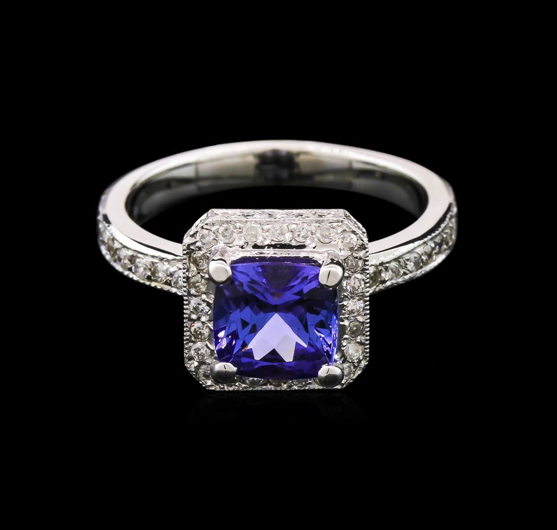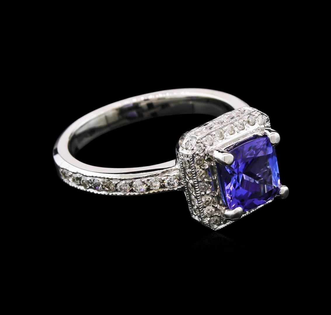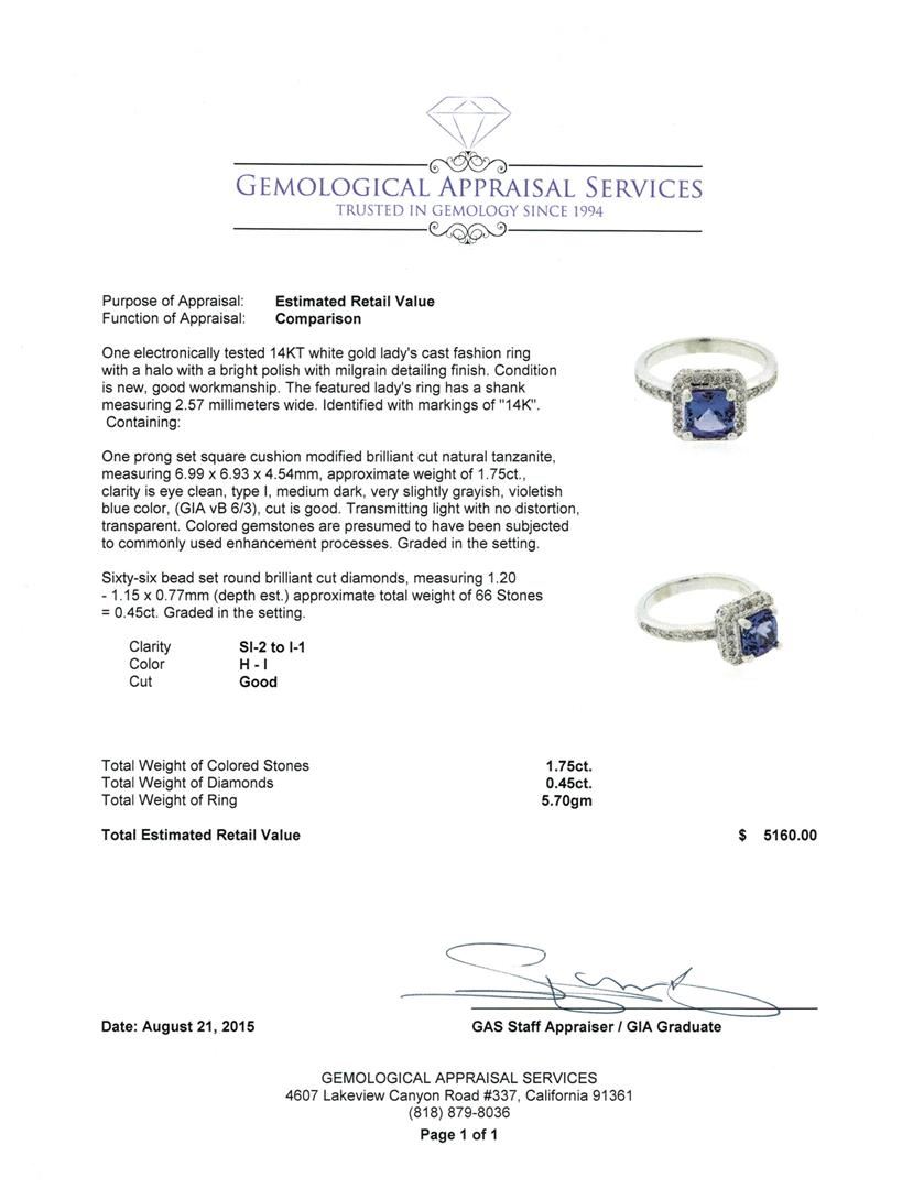 One electronically tested 14KT white gold lady's cast fashion ring with a halo with a bright polish with milgrain detailing finish. The featured lady's ring has a shank measuring 2.57 millimeters wide. Identified with markings of "14K". Condition is new, good workmanship. Containing: One prong set square cushion modified brilliant cut natural tanzanite, measuring 6.99 x 6.93 x 4.54mm, approximate weight of 1.75ct., clarity is eye clean, type I, medium dark, very slightly grayish, violetish blue color, (GIA vB 6/3), cut is good. Transmitting light with no distortion, transparent. Colored gemstones are presumed to have been subjected to commonly used enhancement processes. Graded in the setting. Sixty-Six bead set round brilliant cut diamonds, measuring 1.20 - 1.15 x 0.77mm (depth est.) approximate total weight of 66 Stones = 0.45ct. Graded in the setting. Clarity: SI-2 to I-1. Color: H - I. Cut Good. Total Weight of Colored Stones 1.75ct. Total Weight of Diamonds 0.45ct. Total Weight of Ring 5.70gm. GAS Appraised.