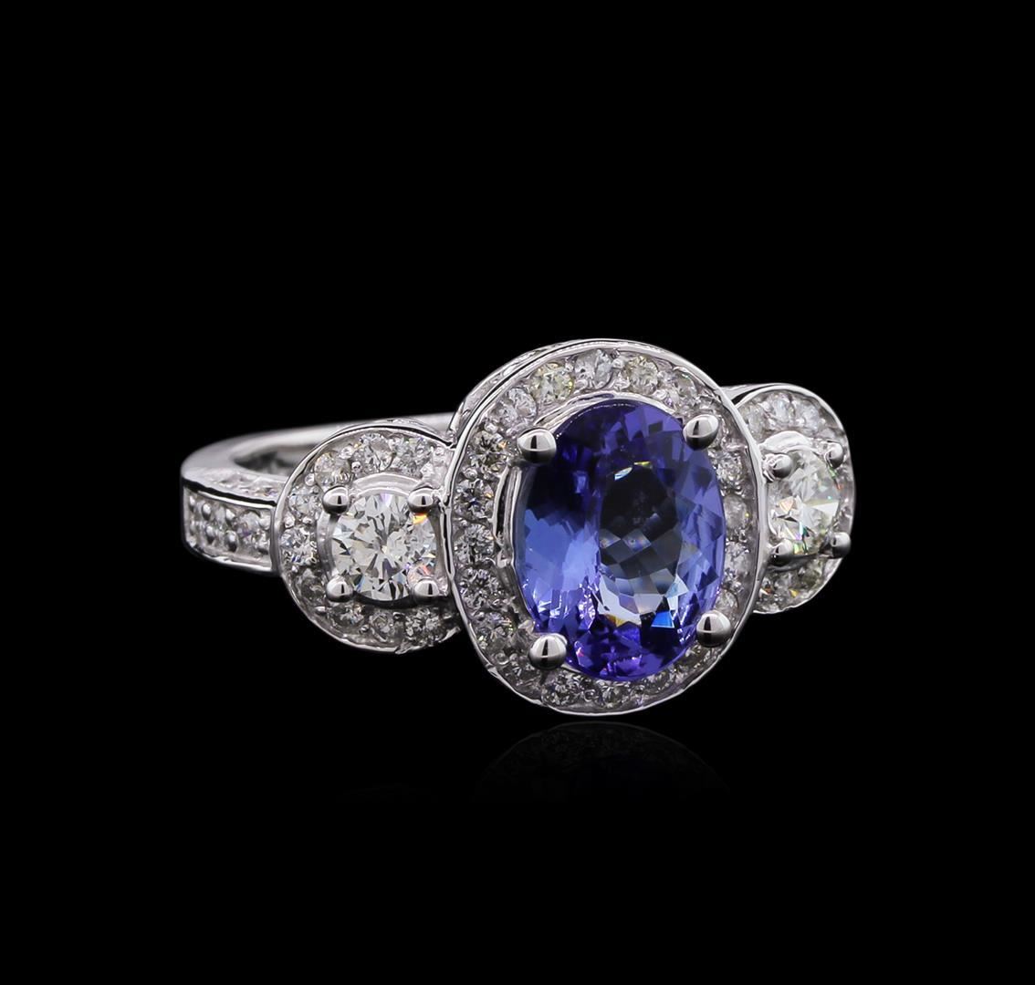 One electronically tested 14KT white gold lady's cast 3-stone halo ring with a bright polish finish. The featured lady's ring has a shank measuring 2.06 millimeters in width. Identified with markings of "14K". Condition is new, good workmanship. Containing: One prong set oval modified brilliant cut natural tanzanite, measuring 9.20 x 7.11 x 3.90mm, approximate weight of 1.75ct., clarity is eye clean, type I, medium light, moderately strong, bluish violet color, (GIA bV 4/4), cut is good. Transmitting light with no distortion, transparent. Colored gemstones are presumed to have been subjected to commonly used enhancement processes. Graded in the setting. Two prong set round brilliant cut diamonds, measuring 3.50 - 3.46 x 2.09mm (depth est.) approximate total weight of 2 Stones = 0.30 ct. Graded in the setting. Clarity: SI-2. Color: I - Good Forty-Four prong set round brilliant cut diamonds, measuring 1.40 - 1.35 x 0.90mm (depth est.) approximate total weight of 44 Stones = 0.47ct. Graded in the setting. Clarity: SI-2 to I-1. Color: H - I. Cut Good Twenty-Eight prong set round brilliant cut diamonds, measuring 1.30 - 1.20 x 0.75mm (depth est.) approximate total weight of 28 Stones = 0.20 ct. Graded in the setting. Clarity: SI-2 to I-1. Color: H - I. Cut Good. Total Weight of Colored Stones 1.75ct. Total Weight of Diamonds 0.97ct. Total Weight of Ring 5.50gm. GAS Appraised.