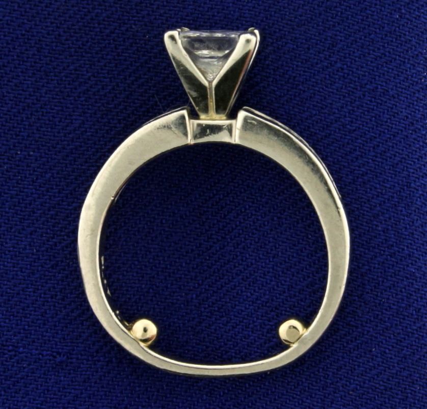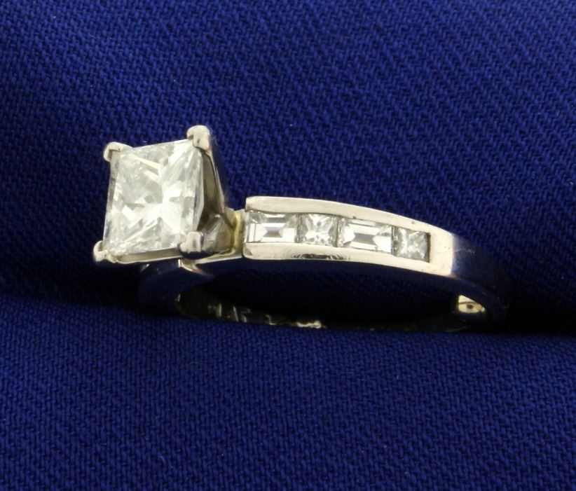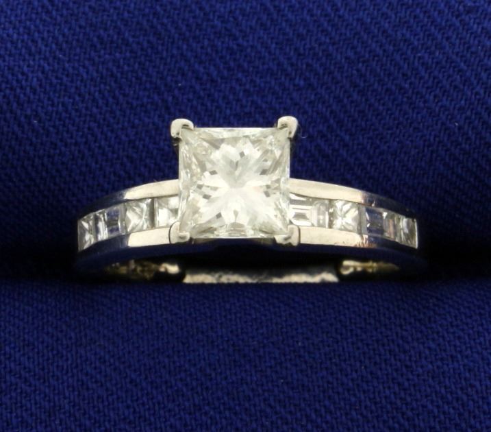 In Platinum, containing a center diamond that is 1.25ct Princess cut of ultra high quality, VVS Clarity/G color. Also containing 1/2 ct TW of square and rectangle shaped diamonds in shank of similar quality. Stability balls in inside of band. Size 7. 6.1g