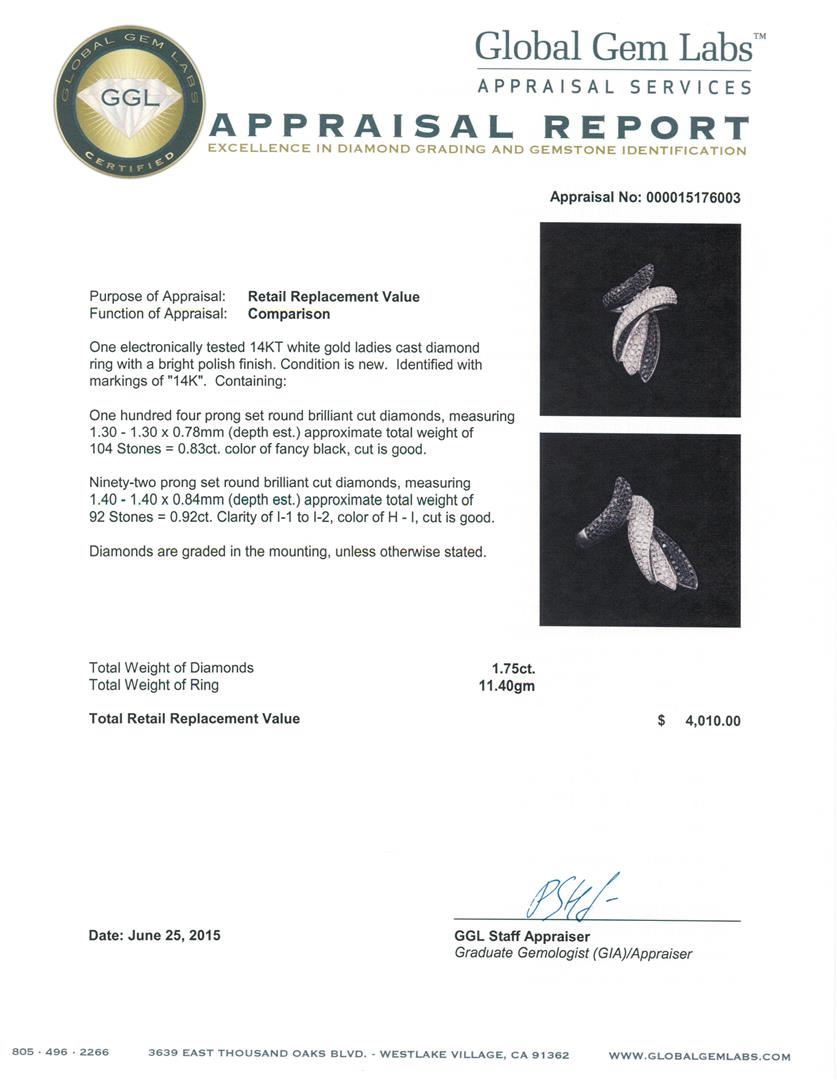 One electronically tested 14KT white gold ladies cast diamond ring with a bright polish finish. Identified with markings of "14K". Condition is new. Containing: One Hundred Four prong set round brilliant cut diamonds, measuring 1.30 - 1.30 x 0.78mm (depth est.) approximate total weight of 104 Stones = 0.83ct. Cut is Good. Ninety-Two prong set round brilliant cut diamonds, measuring 1.40 - 1.40 x 0.84mm (depth est.) approximate total weight of 92 Stones = 0.92ct. Clarity: I-1 to I-2. Color: H - I, Cut is Good. Diamonds are graded in the mounting, unless otherwise stated. Total Weight of Diamonds 1.75ct. Total Weight of Ring 11.40 grams. GGL Appraised at $4,010.00.
