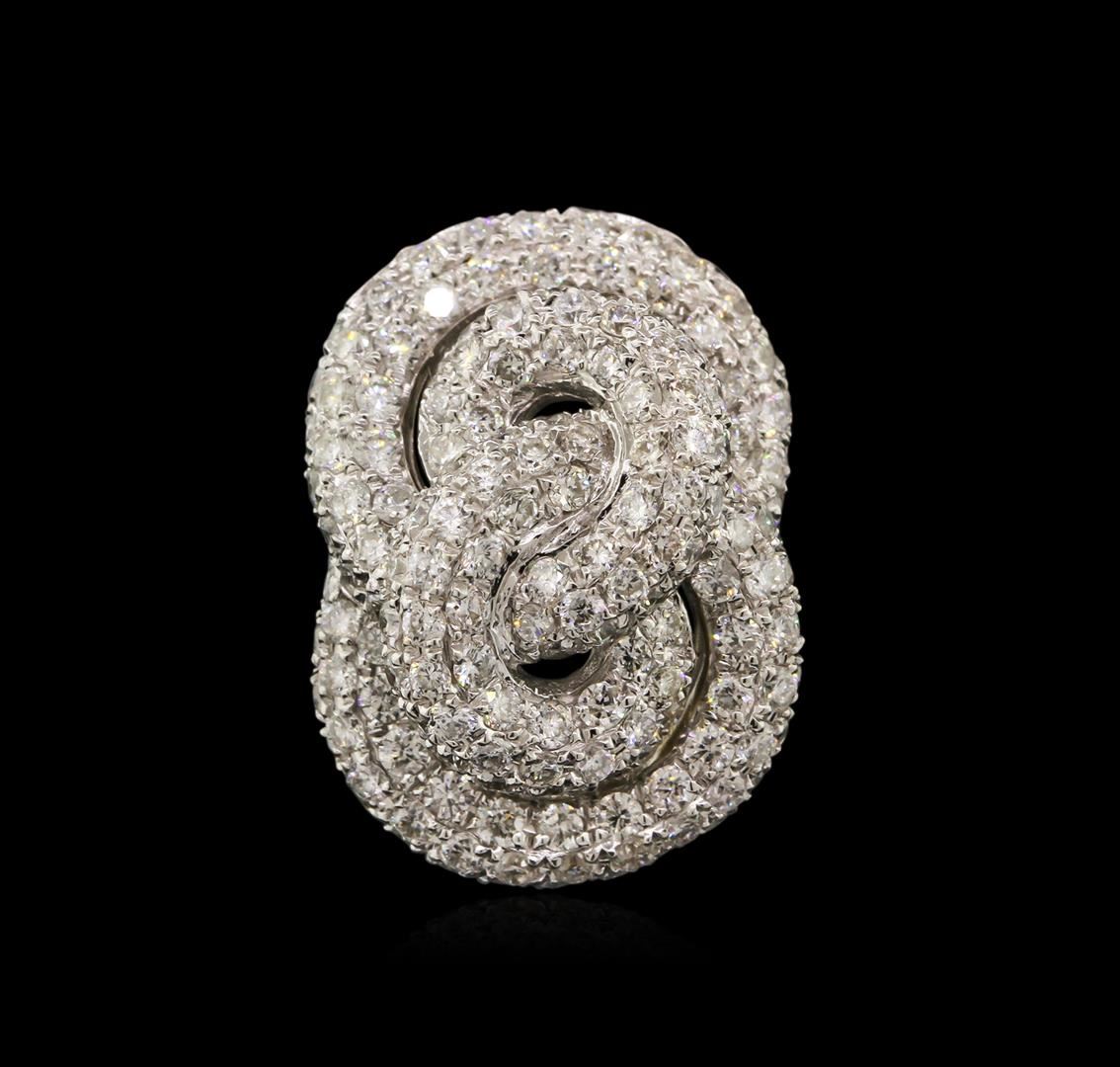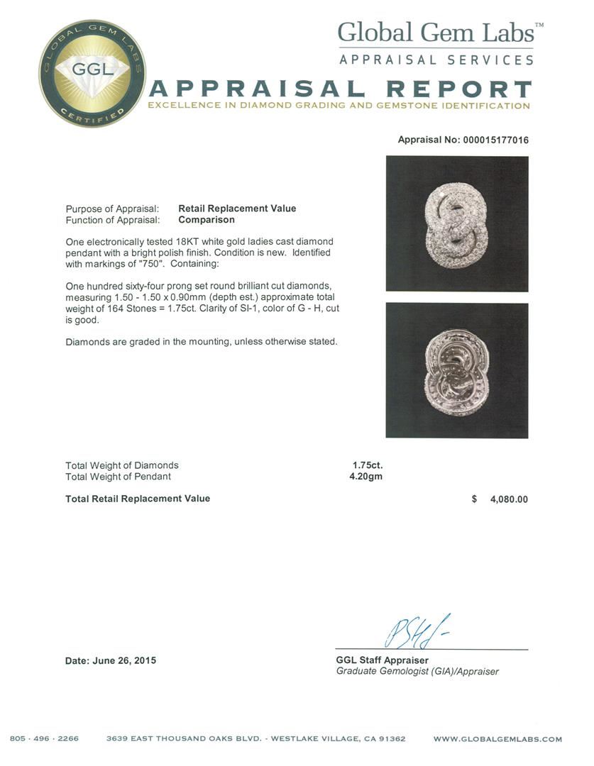 One electronically tested 18KT white gold ladies cast diamond pendant with a bright polish finish. Identified with markings of "750". Condition is new. Containing: One Hundred Sixty-Four prong set round brilliant cut diamonds, measuring 1.50 - 1.50 x 0.90mm (depth est.) approximate total weight of 164 Stones = 1.75ct. Clarity: SI-1. Color: G - H, Cut is Good. Diamonds are graded in the mounting, unless otherwise stated. Total Weight of Diamonds 1.75ct. Total Weight of Pendant 4.20 grams. GGL Appraised at $4,080.00.