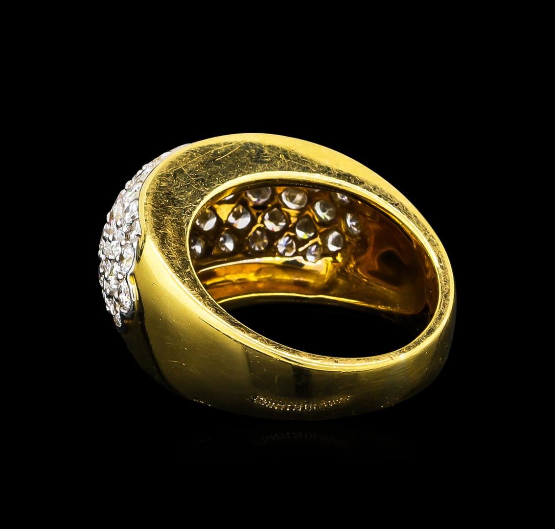 18K Multi-Tone Gold 1.75CT Diamond Ring. Description: Metal: 18k solid multi-tone gold. Face Measurements: 11 x 20mm. Size: 5. Shank Width: 4.5mm. Finish: bright polish. Total Item Weight: 12 grams. Markings: stamped 18K. Country Made: USA. Main Stone: diamond. Quantity: 59. Shape: round. Color: white. Carat Total Weight: 1.75. Measurements: 1.5 x 2mm. Treatment: none. Setting: prong. Color Grade: F-G. Clarity: VS1-VS2. Cut: very good. Excellent Workmanship. Gemstones graded in the mounting. BHGL Appraised at $9,400.00.