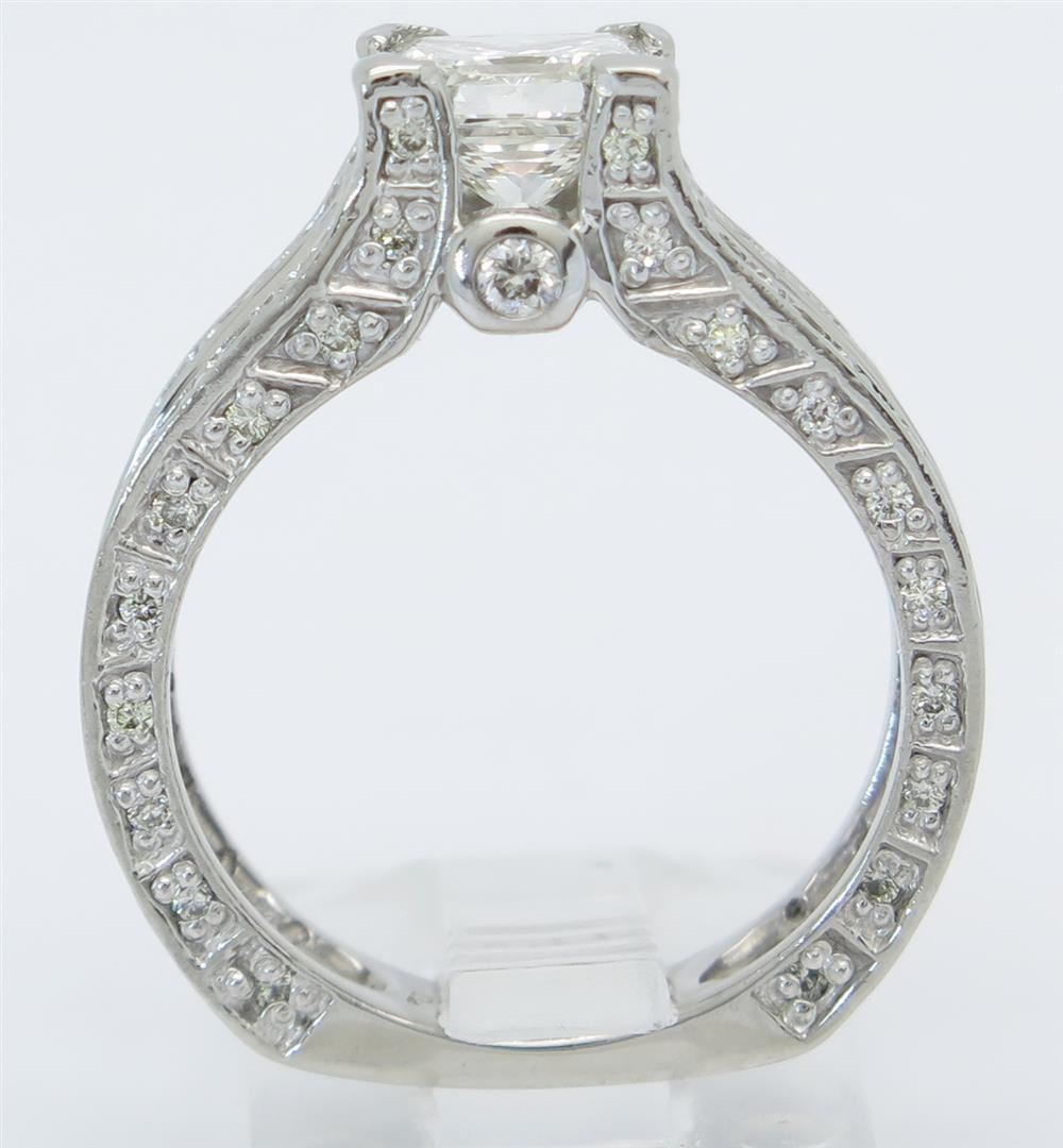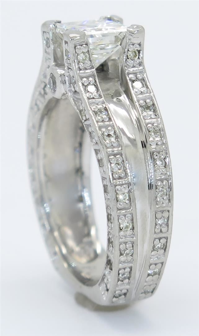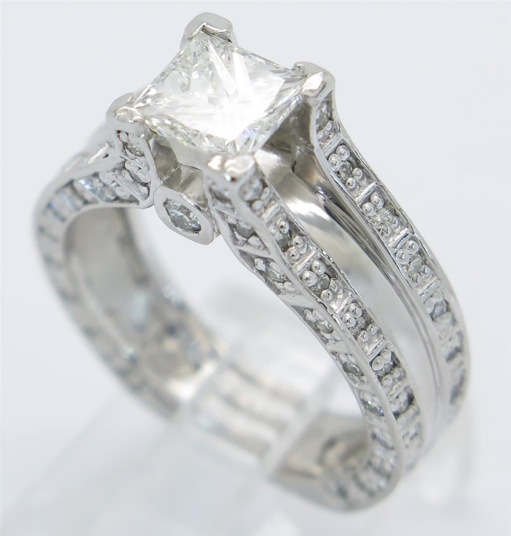 One tested platinum diamond ring. Containing: 1 Princess Cut Diamond. Approximate Weight: 1.05CT, Clarity: SI2, Color: H-I. 82 Round Brilliant Cut Diamonds. Approximate total diamond weight: 1.75CTW. Diamonds are graded in the mounting, unless otherwise stated. Weight of ring: 9.5 grams. Size: 5.5.