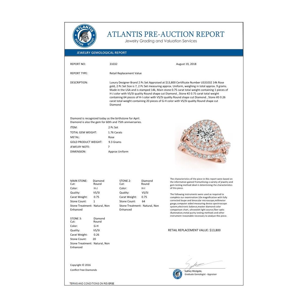 REF-251W3F -31032 ---- 1.76 CTW Certified VS/SI Diamond 2Pc Wedding Set Solitaire Halo 14K Rose Gold ---- Luxury Designer Brand 2 Pc Set Appraised at $13,800 Certificate Number US31032 14k Rose gold, 2 Pc Set Size is 7, 2 Pc Set measuring approx. Uniform, weighing in total approx. 9 grams. Made in the USA and is stamped 14k, Main stone 0.75 carat total weight containing 1 pieces of H-J color with VS/SI quality Round shape cut Diamond , Stone #2 0.75 carat total weight containing 64 pieces of H-I color with VS/SI quality Round shape cut Diamond , Stone #3 0.26 carat total weight containing 20 pieces of G-H color with VS/SI quality Round shape cut Diamond