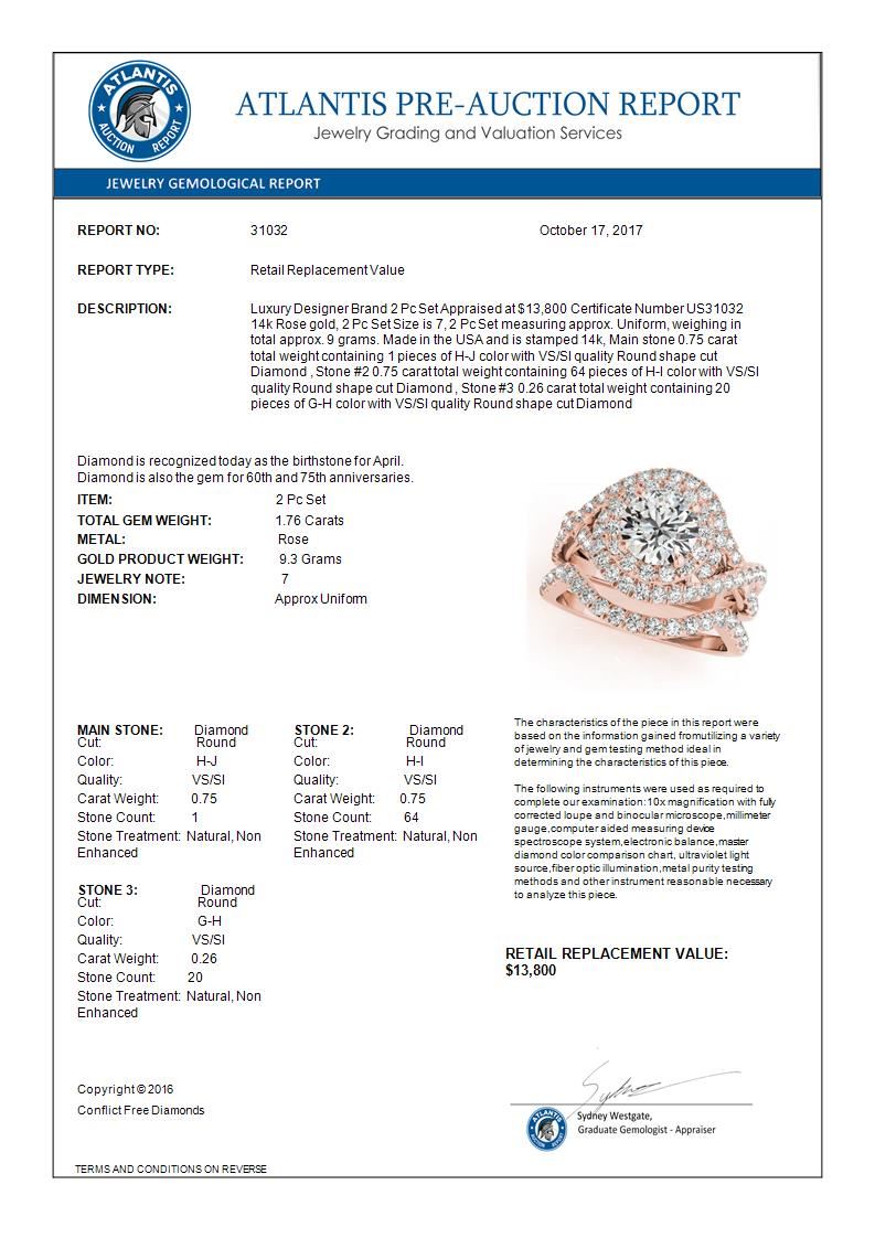 31032 - REF-251X3R ---- 1.76 CTW Certified VS/SI Diamond 2Pc Wedding Set Solitaire Halo 14K Rose Gold ---- Luxury Designer Brand 2 Pc Set Appraised at $13,800 Certificate Number US31032 14k Rose gold, 2 Pc Set Size is 7, 2 Pc Set measuring approx. Uniform, weighing in total approx. 9 grams. Made in the USA and is stamped 14k, Main stone 0.75 carat total weight containing 1 pieces of H-J color with VS/SI quality Round shape cut Diamond , Stone #2 0.75 carat total weight containing 64 pieces of H-I color with VS/SI quality Round shape cut Diamond , Stone #3 0.26 carat total weight containing 20 pieces of G-H color with VS/SI quality Round shape cut Diamond