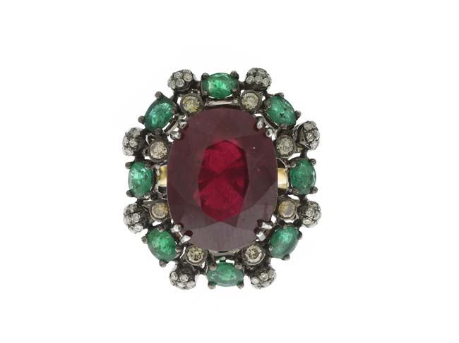 RUBY, EMERALD AND DIAMOND RING/Diamond Count 1:/Diamond Total Carat :1.76/Diamond Color & Clarity:J-L/I1-I2 Single Cut /Diamond Count 2:/Diamond 2 CTW:/Diamond Count 3:/Gemstone Count 1:/Gemstone CTW:/Gemstone Dimension:/Gemstone Shape:/Gemstone Count 2:/Gemstone Shape:/Ring Dimension:H28xW25mm/Metal Type 1:14kYellow Gold :Gram Weight:3.66/Metal Type 2:over0.925Sterling Silver / Weight Gram:10.16/Gross Weight :12.19/Ring Size:7