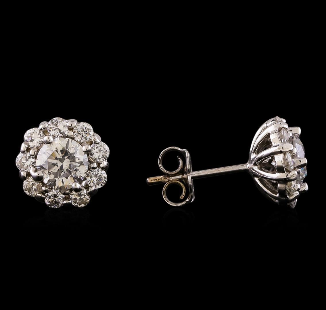 One pair electronically tested 14KT white gold lady's combination cast & assembled halo stud earrings with medium friction backs with a bright polish finish. Identified with markings of "14K". Condition is new, good workmanship. Containing: Two prong set round brilliant cut diamonds, measuring 5.13 - 5.07 x 3.16mm (depth est.) , 5.00.%. GTCF approximate total weight of 2 Stones = 1.11ct. Graded in the setting. Clarity: SI-1 to SI-2. Color: I - Good Eighteen prong set round brilliant cut diamonds, measuring 2.20 - 2.10 x 1.29mm (depth est.) approximate total weight of 18 Stones = 0.65ct. Graded in the setting. Clarity: SI-1 to SI-2. Color: H - I. Cut Good. Total Weight of Diamonds 1.76ct. Total Weight of Earrings 2.40gm. GAS Appraised.