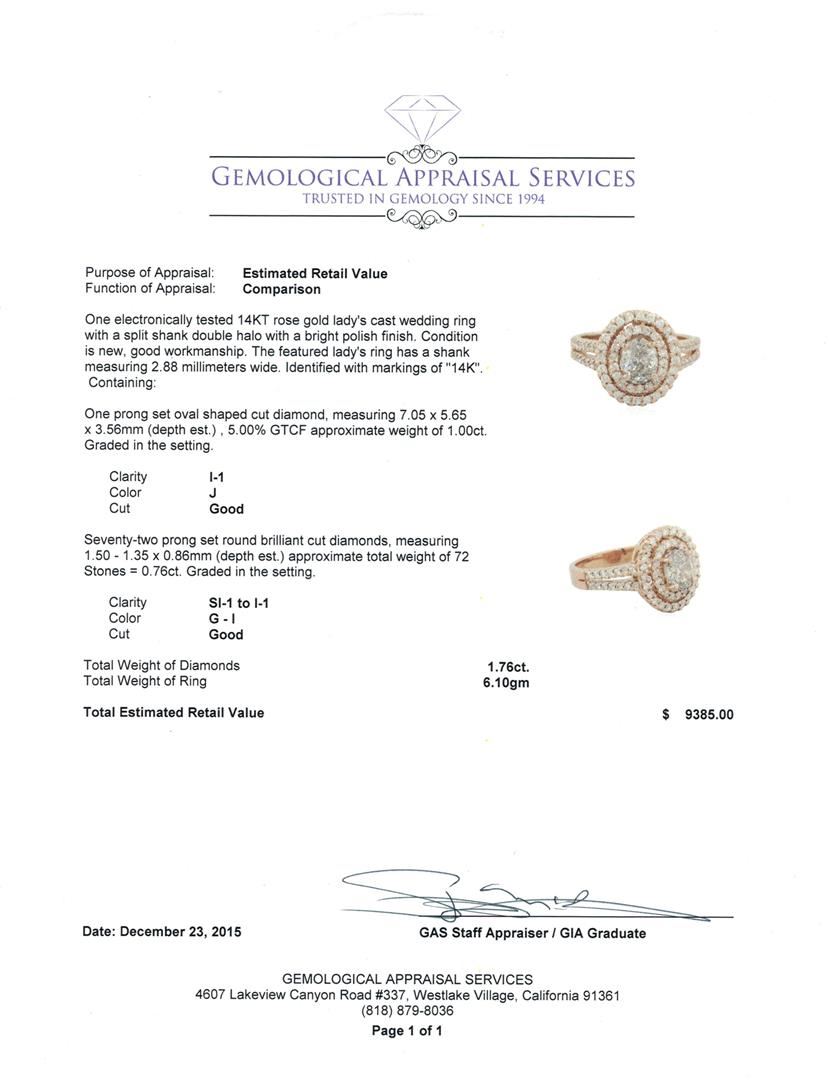 One electronically tested 14KT rose gold lady's cast wedding ring with a split shank double halo with a bright polish finish. The featured lady's ring has a shank measuring 2.88 millimeters wide. Identified with markings of "14K". Condition is new, good workmanship. Containing: One prong set oval shaped cut diamond, measuring 7.05 x 5.65 x 3.56mm (depth est.) , 5.00% GTCF approximate weight of 1.00ct. Graded in the setting. Clarity: I-1. Color: Good Seventy-Two prong set round brilliant cut diamonds, measuring 1.50 - 1.35 x 0.86mm (depth est.) approximate total weight of 72 Stones = 0.76ct. Graded in the setting. Clarity: SI-1 to I-1. Color: G - I. Cut Good. Total Weight of Diamonds 1.76ct. Total Weight of Ring 6.10gm. GAS Appraised at $9,385.00.