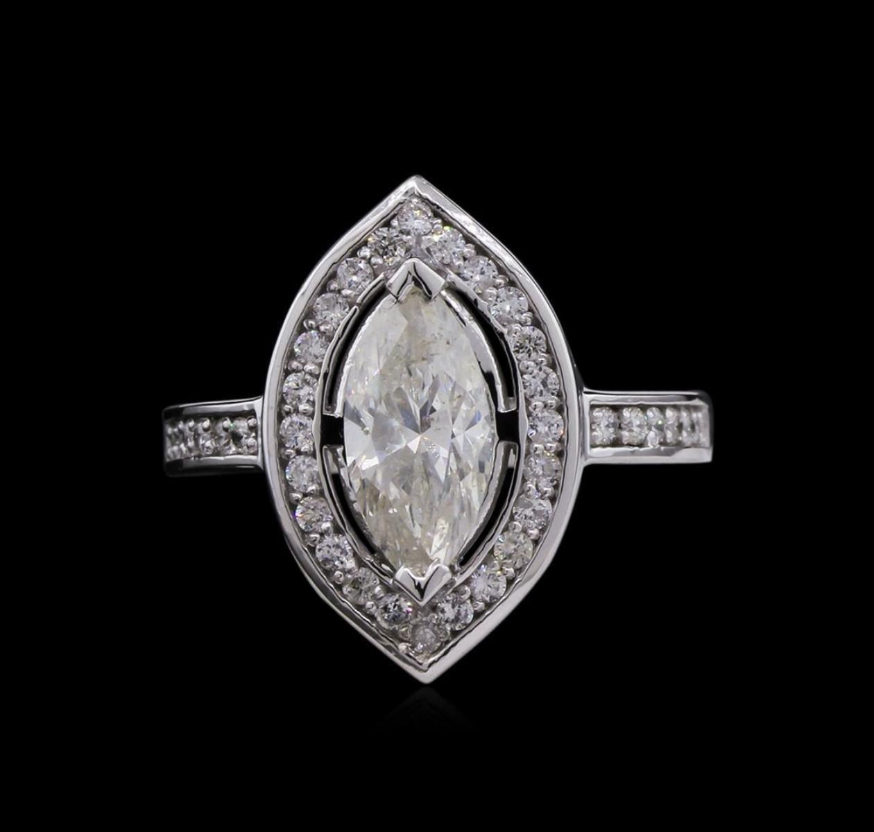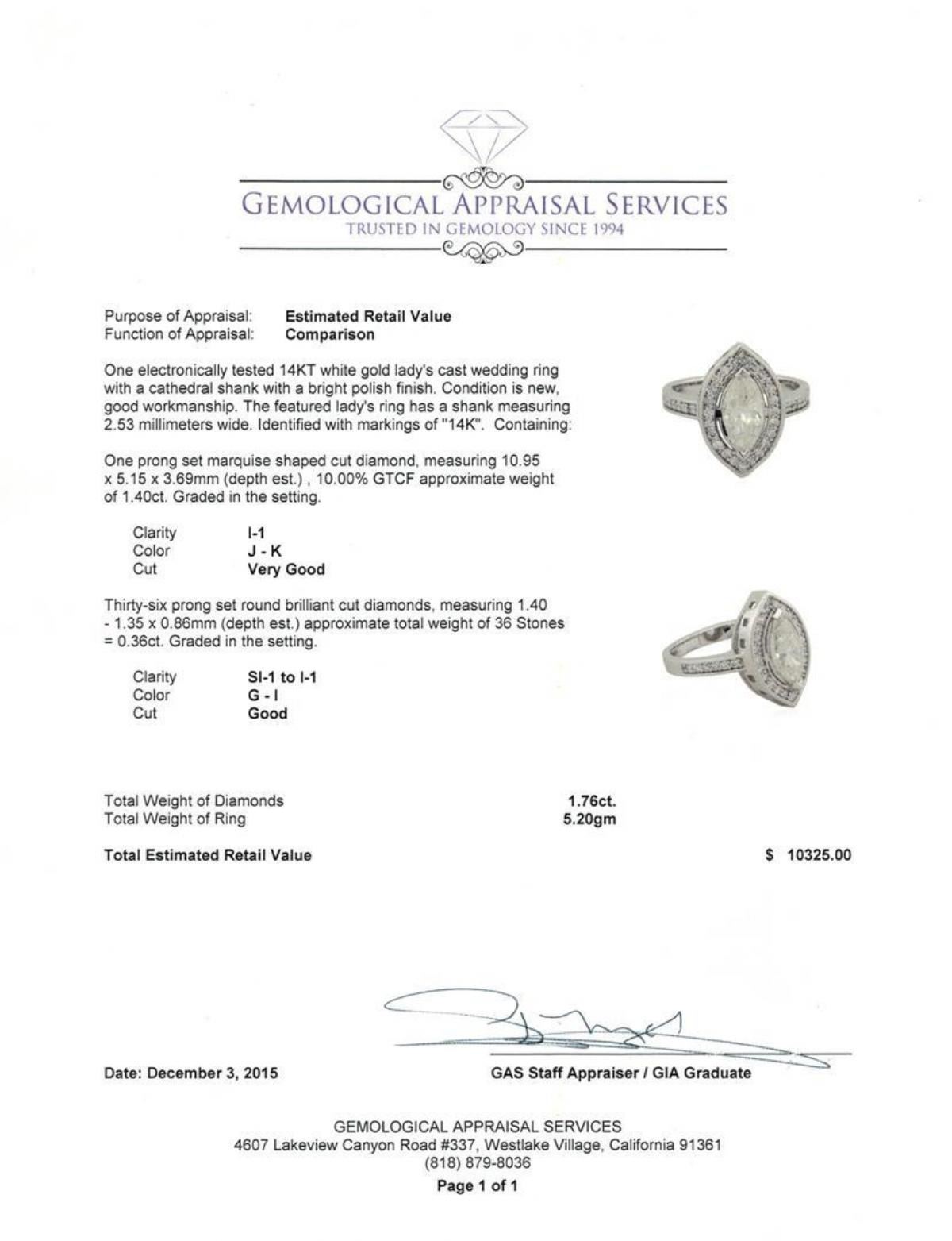 One electronically tested 14KT white gold lady's cast wedding ring with a cathedral shank with a bright polish finish. The featured lady's ring has a shank measuring 2.53 millimeters wide. Identified with markings of "14K". Condition is new, good workmanship. Containing: One prong set marquise shaped cut diamond, measuring 10.95 x 5.15 x 3.69mm (depth est.) , 10.00.%. GTCF approximate weight of 1.40ct. Graded in the setting. Clarity: I-1. Color: J - K. Cut Very Good Thirty-Six prong set round brilliant cut diamonds, measuring 1.40 - 1.35 x 0.86mm (depth est.) approximate total weight of 36 Stones = 0.36ct. Graded in the setting. Clarity: SI-1 to I-1. Color: G - I. Cut Good. Total Weight of Diamonds 1.76ct. Total Weight of Ring 5.20gm. GAS Appraised.