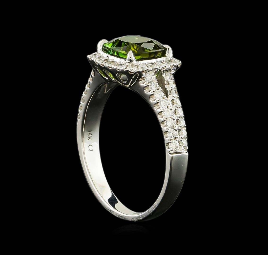 One electronically tested 14KT white gold lady's cast fashion ring with a split shank halo with a bright polish finish. The featured lady's ring has a shank measuring 2.42 millimeters wide. Identified with markings of "14K". Condition is new, good workmanship. Containing: One prong set square cushion modified brilliant cut natural green tourmaline, measuring 7.05 x 7.04 x 4.93mm, approximate weight of 1.76ct., clarity is slightly included, type I, medium dark, moderately strong, slightly yellowish green color, (GIA slyG 6/4), cut is very good. Transmitting light with a minimum of distortion, transparent. Colored gemstones are presumed to have been subjected to commonly used enhancement processes. Graded in the setting. Fifty-Four prong set round brilliant cut diamonds, measuring 1.40 - 1.35 x 0.86mm (depth est.) approximate total weight of 54 Stones = 0.54ct. Graded in the setting. Clarity: SI-1 to SI-2. Color: G - Good. Total Weight of Colored Stones 1.76ct. Total Weight of Diamonds 0.54ct. Total Weight of Ring 4.20gm GAS Appraised at $3,750.00.