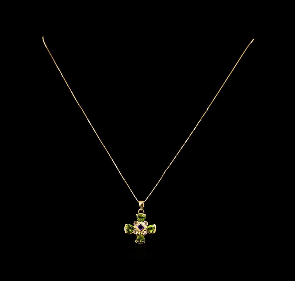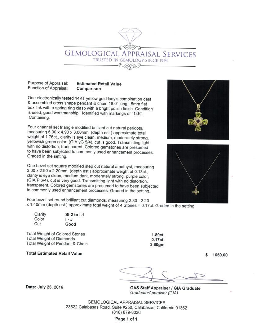 One electronically tested 14KT yellow gold lady's combination cast & assembled cross shape pendant & chain 18.0' long,.5mm flat box link with a spring ring clasp with a bright polish finish. Identified with markings of '14K'. Condition is used, good workmanship. Containing: Four channel set triangle modified brilliant cut natural peridots, measuring 5.00 x 4.90 x 3.00mm, (depth est.) approximate total weight of 1.76ct., clarity is eye clean, medium, moderately strong, yellowish green color, (GIA yG 5/4), cut is good. Transmitting light with no distortion, transparent. Colored gemstones are presumed to have been subjected to commonly used enhancement processes. Graded in the setting. One bezel set square modified step cut natural amethyst, measuring 3.00 x 2.90 x 2.20mm, (depth est.) approximate weight of 0.13ct., clarity is eye clean, medium dark, moderately strong, purple color, (GIA P 6/4), cut is very good. Transmitting light with no distortion, transparent. Colored gemstones are presumed to have been subjected to commonly used enhancement processes. Graded in the setting. Four bezel set round brilliant cut diamonds, measuring 2.30 - 2.20 x 1.40mm (depth est.) approximate total weight of 4 Stones = 0.17ct. Graded in the setting. Clarity SI-2 to I-1. Color: I - J Cut Good. Total Weight of Colored Stones 1.89ct.. Total Weight of Diamonds 0.17ct.. Total Weight of Pendant & Chain 3.60gm. GAS Appraised at $1,650.00.
