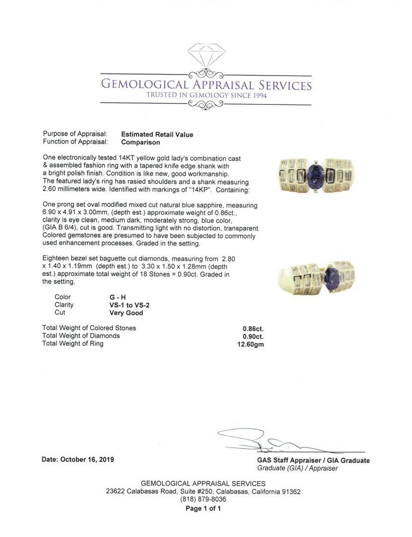 One electronically tested 14KT yellow gold lady's combination cast & assembled fashion ring with a tapered knife edge shank with a bright polish finish. The featured lady's ring has rasied shoulders and a shank measuring 2.60 millimeters wide. Identified with markings of '14KP'. Condition is Good. Containing: One prong set oval modified mixed cut natural blue sapphire, measuring 6.90 x 4.91 x 3.00mm, (depth est.) approximate weight of 0.86ct., clarity is eye clean, medium dark, moderately strong, blue color, (GIA B 6/4), cut is good. Transmitting light with no distortion, transparent. Colored gemstones are presumed to have been subjected to commonly used enhancement processes. Graded in the setting. Eighteen bezel set baguette cut diamonds, measuring from 2.80 x 1.40 x 1.19mm (depth est.) to 3.30 x 1.50 x 1.28mm (depth est.) approximate total weight of 18 Stones = 0.90ct. Graded in the setting. Color G - H Clarity VS-1 to VS-2 Cut Very Good. Total Weight of Colored Stones 0.86ct.. Total Weight of Diamonds 0.90ct.. Total Weight of Ring 12.60gm GAS Appraised at $5555.00. GAS Appraised.