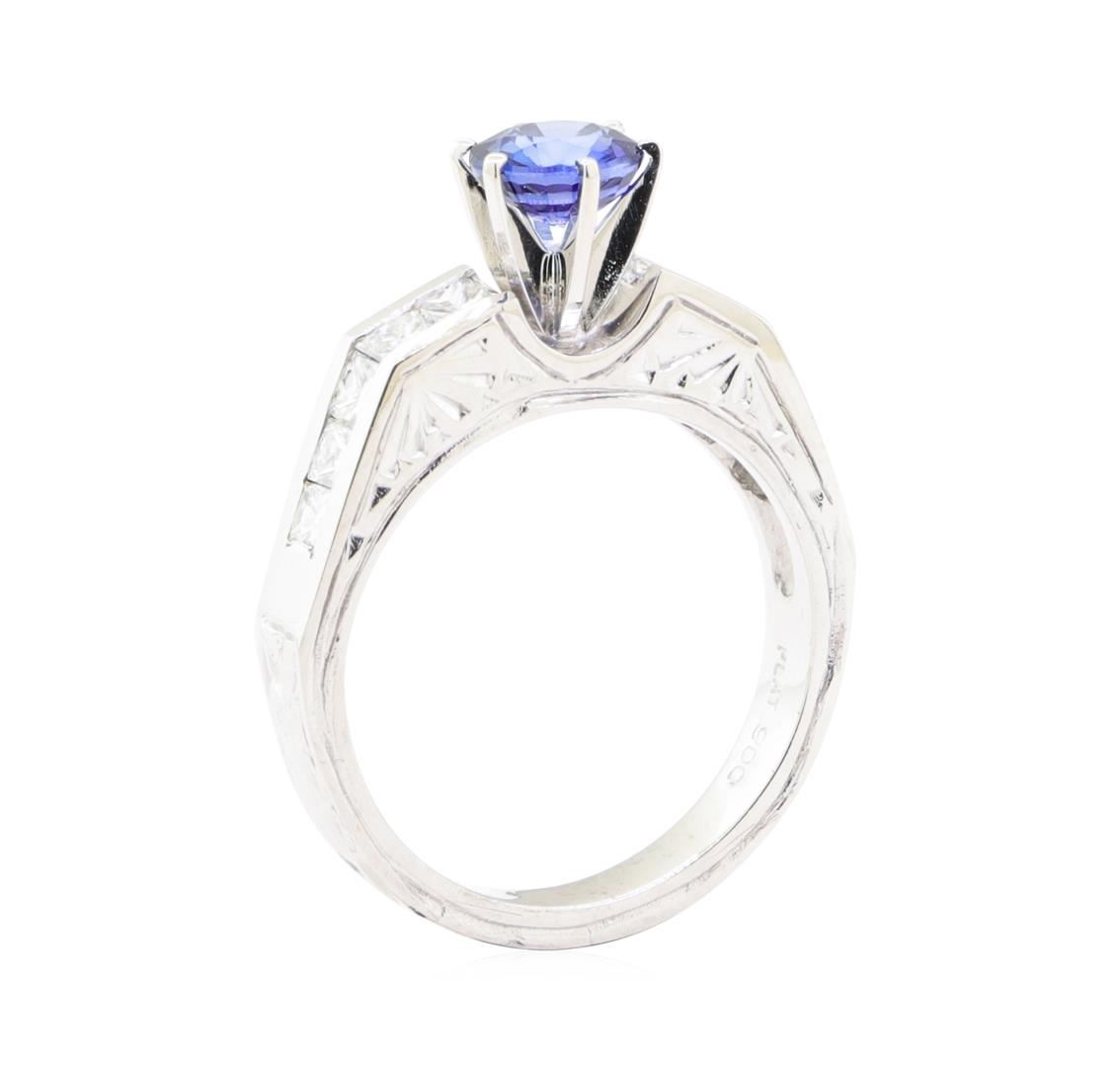 One electronically tested platinum lady's combination cast & assembled straight line fashion ring with a hand engraving, vintage motif with a bright polish, hand-engraved detail finish. The featured lady's ring has a shank measuring 3.30 millimeters in width. Identified with markings of 'PLAT'. Condition is new, good workmanship. Containing: One prong set round modified brilliant cut natural blue sapphire, measuring 6.05 - 6.01 x 3.92 mm, (depth est.) approximate weight of 1.08ct., clarity is eye clean, medium dark, moderately strong, blue color, (GIA B 6/4), cut is good. Transmitting light with no distortion, transparent. Colored gemstones are presumed to have been subjected to commonly used enhancement processes. Graded in the setting. Ten channel set princess cut diamonds, measuring 2.30 x 2.20 x 1.65mm (depth est.) approximate total weight of 10 Stones = 0.68ct. Graded in the setting. Color G - H Clarity VS-1 to VS-2 Cut Very Good. Total Weight of Colored Stones 1.08ct.. Total Weight of Diamonds 0.68ct.. Total Weight of Ring 9.00gm GAS Appraised at $4495.00. GAS Appraised.