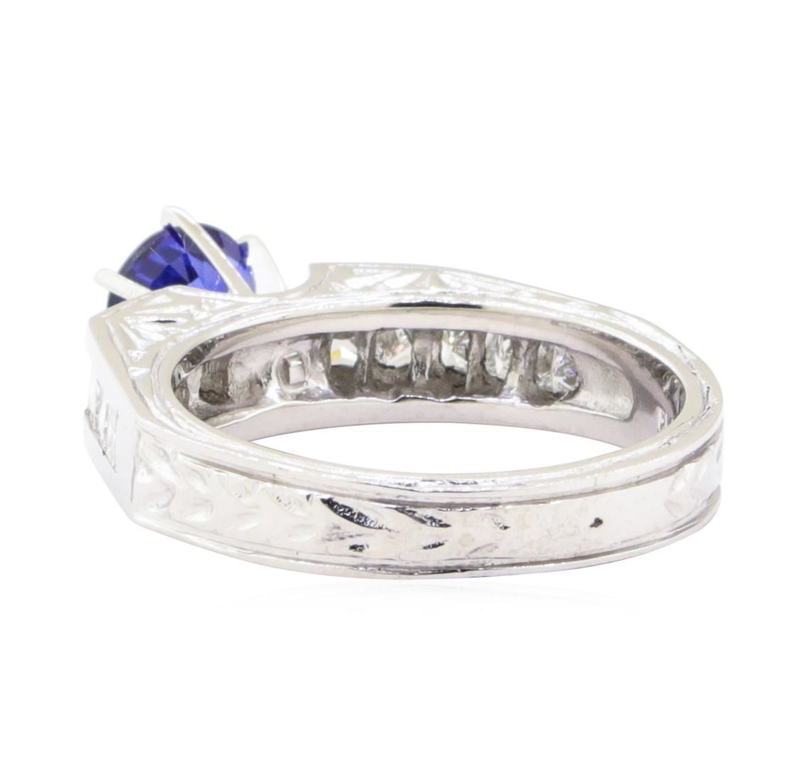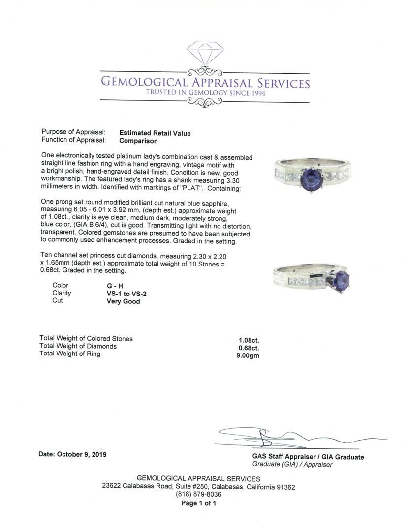 One electronically tested platinum lady's combination cast & assembled straight line fashion ring with a hand engraving, vintage motif with a bright polish, hand-engraved detail finish. The featured lady's ring has a shank measuring 3.30 millimeters in width. Identified with markings of 'PLAT'. Condition is new, good workmanship. Containing: One prong set round modified brilliant cut natural blue sapphire, measuring 6.05 - 6.01 x 3.92 mm, (depth est.) approximate weight of 1.08ct., clarity is eye clean, medium dark, moderately strong, blue color, (GIA B 6/4), cut is good. Transmitting light with no distortion, transparent. Colored gemstones are presumed to have been subjected to commonly used enhancement processes. Graded in the setting. Ten channel set princess cut diamonds, measuring 2.30 x 2.20 x 1.65mm (depth est.) approximate total weight of 10 Stones = 0.68ct. Graded in the setting. Color G - H Clarity VS-1 to VS-2 Cut Very Good. Total Weight of Colored Stones 1.08ct.. Total Weight of Diamonds 0.68ct.. Total Weight of Ring 9.00gm GAS Appraised at $4495.00. GAS Appraised at $4,495.00.