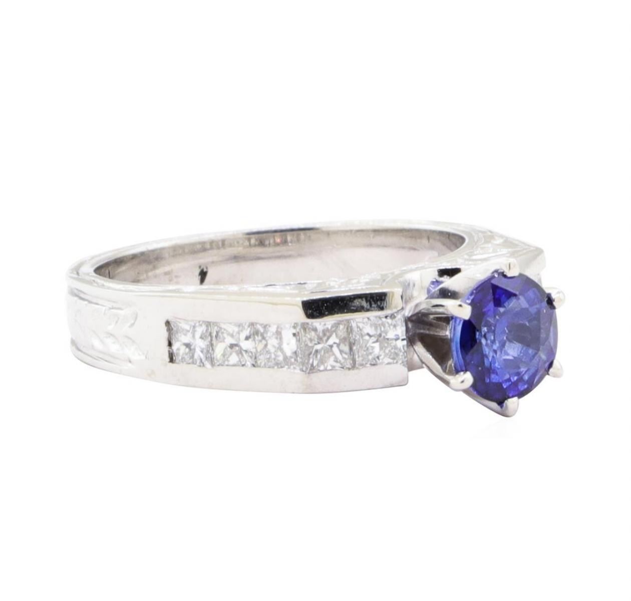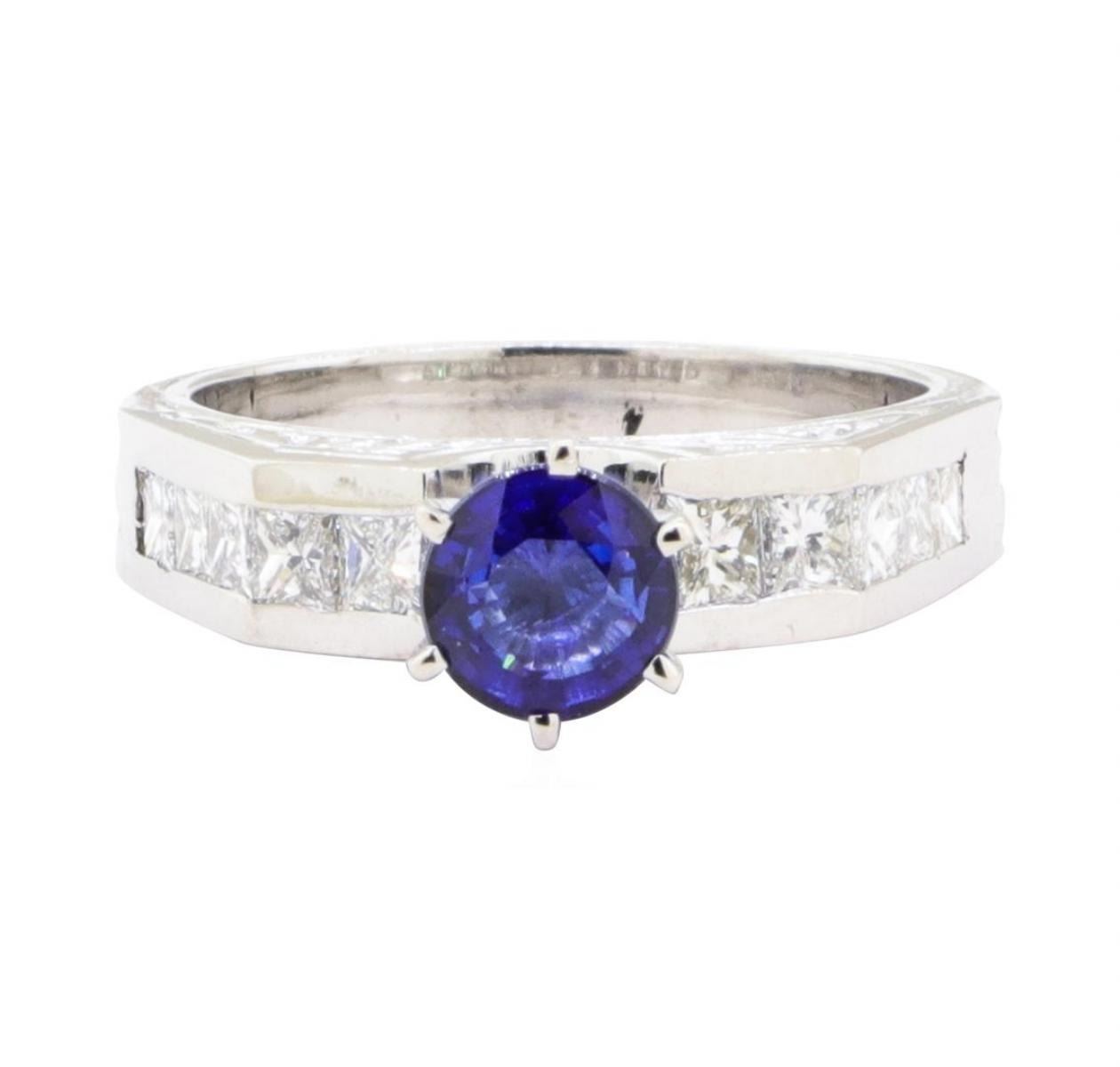 One electronically tested platinum lady's combination cast & assembled straight line fashion ring with a hand engraving, vintage motif with a bright polish, hand-engraved detail finish. The featured lady's ring has a shank measuring 3.30 millimeters in width. Identified with markings of 'PLAT'. Condition is new, good workmanship. Containing: One prong set round modified brilliant cut natural blue sapphire, measuring 6.05 - 6.01 x 3.92 mm, (depth est.) approximate weight of 1.08ct., clarity is eye clean, medium dark, moderately strong, blue color, (GIA B 6/4), cut is good. Transmitting light with no distortion, transparent. Colored gemstones are presumed to have been subjected to commonly used enhancement processes. Graded in the setting. Ten channel set princess cut diamonds, measuring 2.30 x 2.20 x 1.65mm (depth est.) approximate total weight of 10 Stones = 0.68ct. Graded in the setting. Color G - H Clarity VS-1 to VS-2 Cut Very Good. Total Weight of Colored Stones 1.08ct.. Total Weight of Diamonds 0.68ct.. Total Weight of Ring 9.00gm GAS Appraised at $4495.00. GAS Appraised.