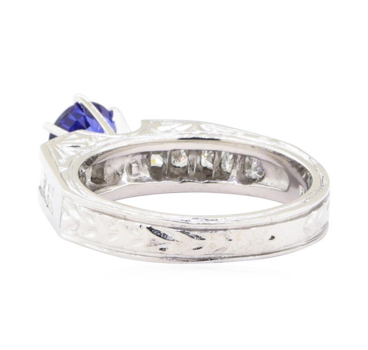 One electronically tested platinum lady's combination cast & assembled straight line fashion ring with a hand engraving, vintage motif with a bright polish, hand-engraved detail finish. The featured lady's ring has a shank measuring 3.30 millimeters in width. Identified with markings of 'PLAT'. Condition is new, good workmanship. Containing: One prong set round modified brilliant cut natural blue sapphire, measuring 6.05 - 6.01 x 3.92 mm, (depth est.) approximate weight of 1.08ct., clarity is eye clean, medium dark, moderately strong, blue color, (GIA B 6/4), cut is good. Transmitting light with no distortion, transparent. Colored gemstones are presumed to have been subjected to commonly used enhancement processes. Graded in the setting. Ten channel set princess cut diamonds, measuring 2.30 x 2.20 x 1.65mm (depth est.) approximate total weight of 10 Stones = 0.68ct. Graded in the setting. Color G - H Clarity VS-1 to VS-2 Cut Very Good. Total Weight of Colored Stones 1.08ct.. Total Weight of Diamonds 0.68ct.. Total Weight of Ring 9.00gm GAS Appraised at $4495.00. GAS Appraised.