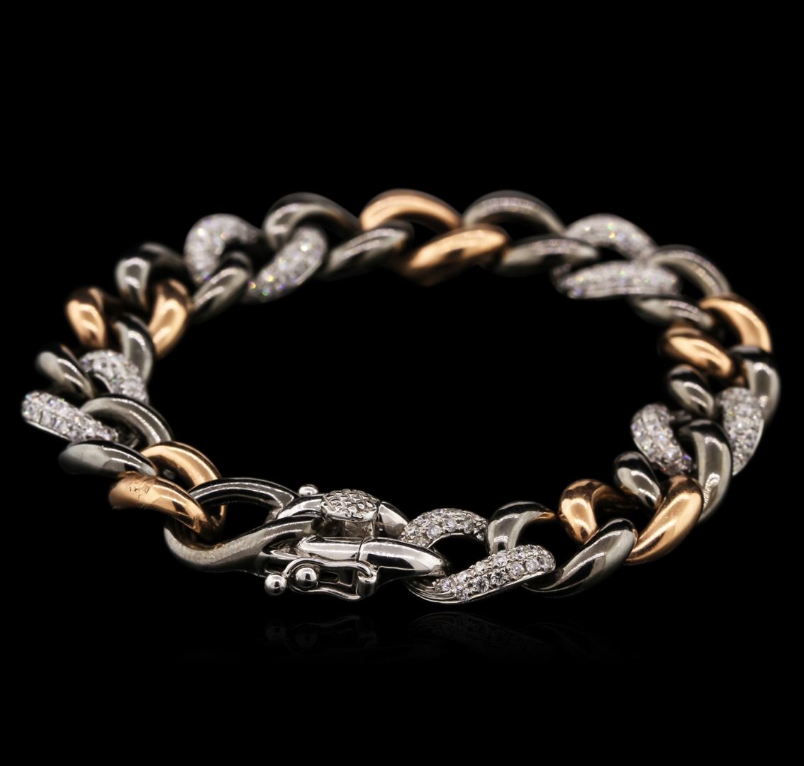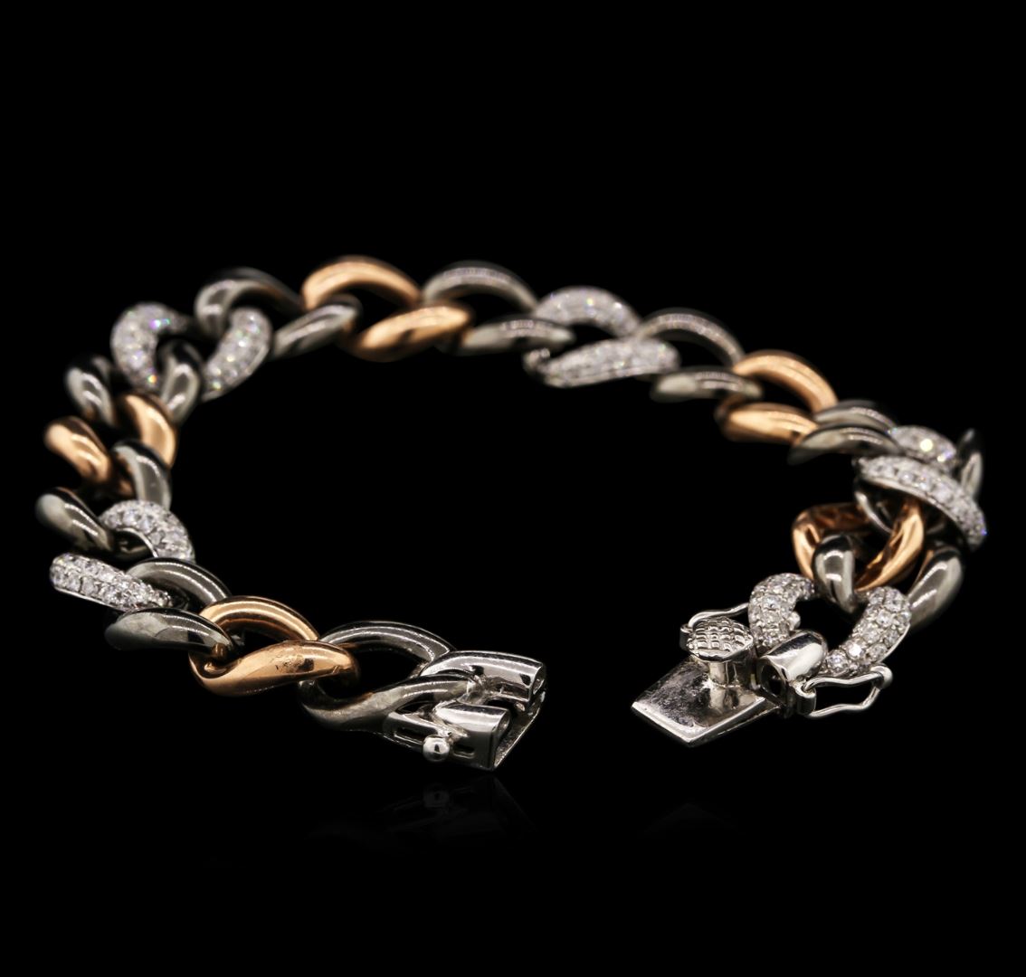 One electronically tested 14KT rose, yellow and white gold ladies cast diamond bracelet with a hidden box clasp with safety closer with a bright polish finish. 7" in length. Identified with markings of "14K". Condition is new. Containing: Two Hundred Twenty prong set round brilliant cut diamonds, measuring 1.30 - 1.30 x 0.78mm (depth est.) approximate total weight of 220 Stones = 1.76ct. Clarity: I-1 to I-2. Color: H - I, Cut is Good. Diamonds are graded in the mounting, unless otherwise stated. Total Weight of Diamonds 1.76ct. Total Weight of Bracelet 25.70 grams. GGL Appraised at $4,410.00.
