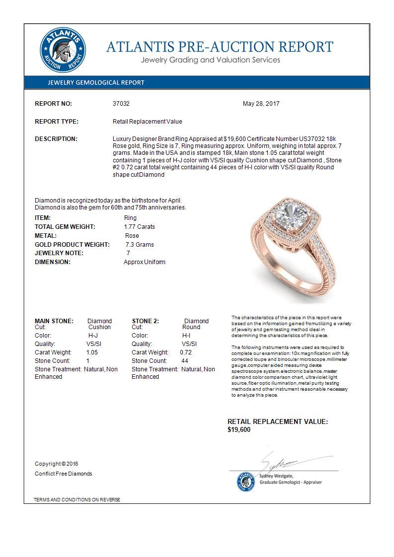 1.77 CTW Cushion VS/SI Diamond Solitaire Art Deco Ring 18K Rose Gold ---- Luxury Designer Brand Ring Appraised Retail Price at $19,600 ---- SKU Number US37032 18k Rose gold Ring Size is 7, Ring measuring approx. Uniform, weighing in total approx. 7 grams. Made in the USA and is stamped 18k, Main stone 1.05 carat total weight containing 1 pieces of H-J color with VS/SI quality Cushion shape cut Diamond , Stone #2 0.72 carat total weight containing 44 pieces of H-I color with VS/SI quality Round shape cut