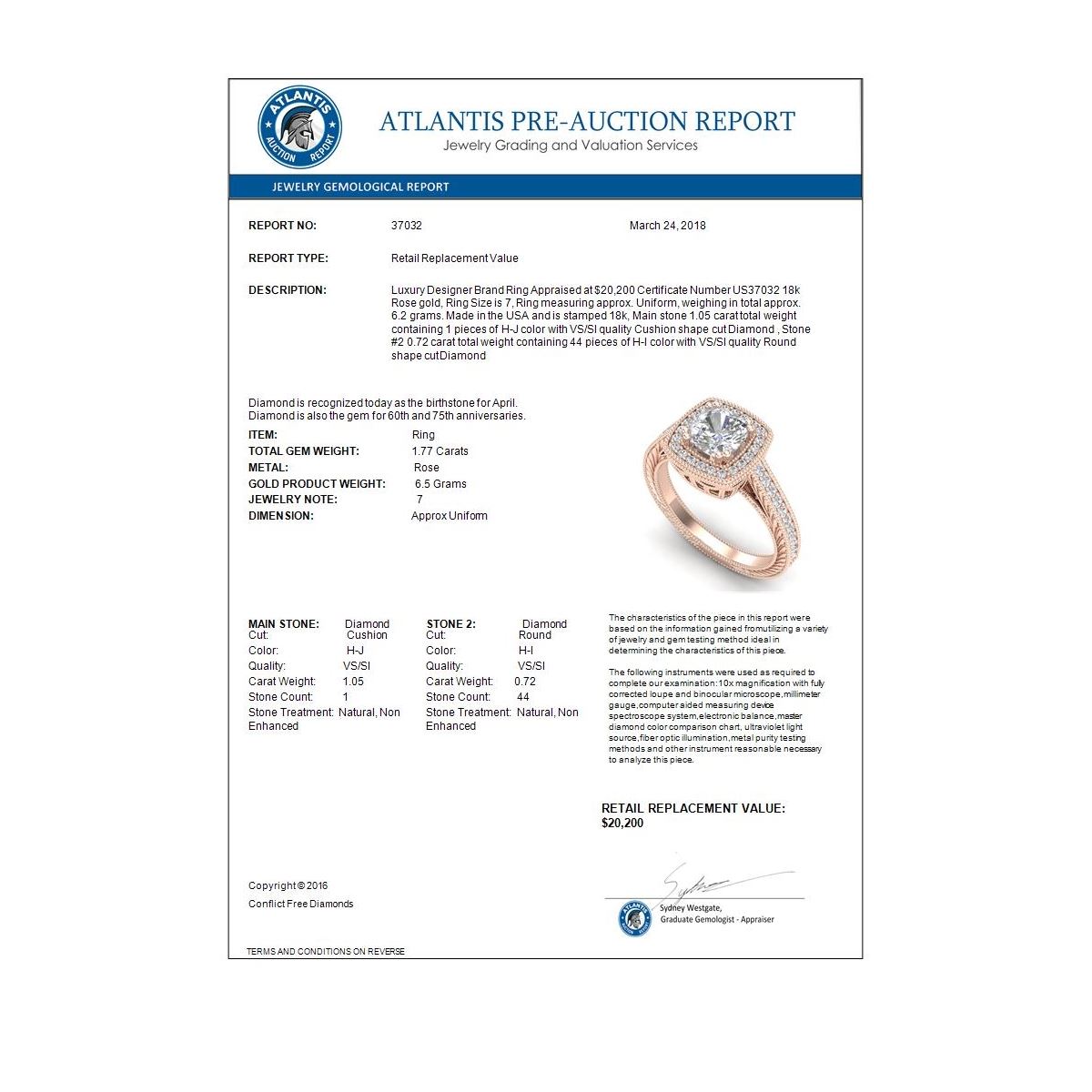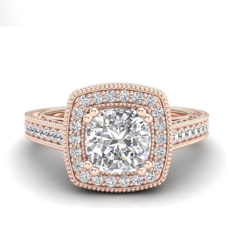 REF-459T3M -37032 ---- 1.77 CTW Cushion VS/SI Diamond Solitaire Art Deco Ring 18K Rose Gold ---- Luxury Designer Brand Ring Appraised at $20,200 Certificate Number US37032 18k Rose gold, Ring Size is 7, Ring measuring approx. Uniform, weighing in total approx. 6.2 grams. Made in the USA and is stamped 18k, Main stone 1.05 carat total weight containing 1 pieces of H-J color with VS/SI quality Cushion shape cut Diamond , Stone #2 0.72 carat total weight containing 44 pieces of H-I color with VS/SI quality Round shape cut Diamond
