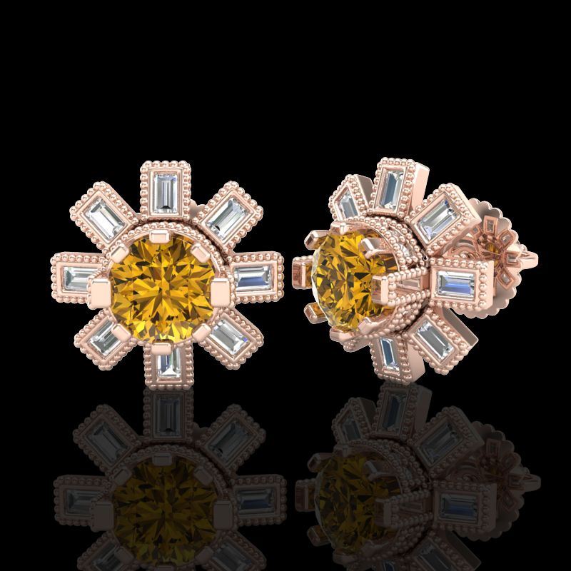 REF-236A4X -37869 ---- 1.77 CTW Intense Fancy Yellow Diamond Art Deco Stud Earrings 18K Rose Gold ---- Luxury Designer Brand Earring Appraised at $15,600 Certificate Number US37869 18k Rose gold, Earring Size is Larger, Earring measuring approx. Uniform, weighing in total approx. 6 grams. Made in the USA and is stamped 18k, Main stone 1.11 carat total weight containing 2 pieces of Intense Fancy Yellow color with SI quality Round shape cut Diamond , Stone #2 0.19 carat total weight containing 20 pieces of H-I color with VS/SI quality Round shape cut Diamond , Stone #3 0.47 carat total weight containing 16 pieces of G-H color with VS/SI quality Baguette shape cut Diamond