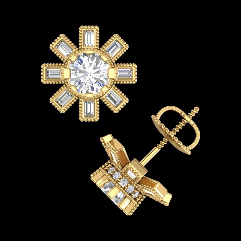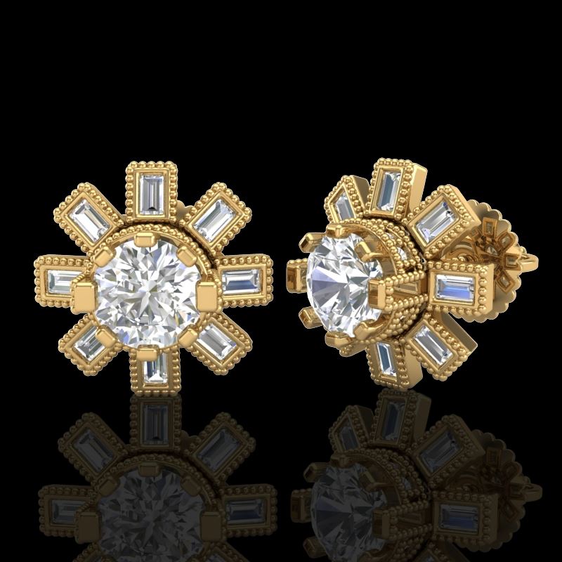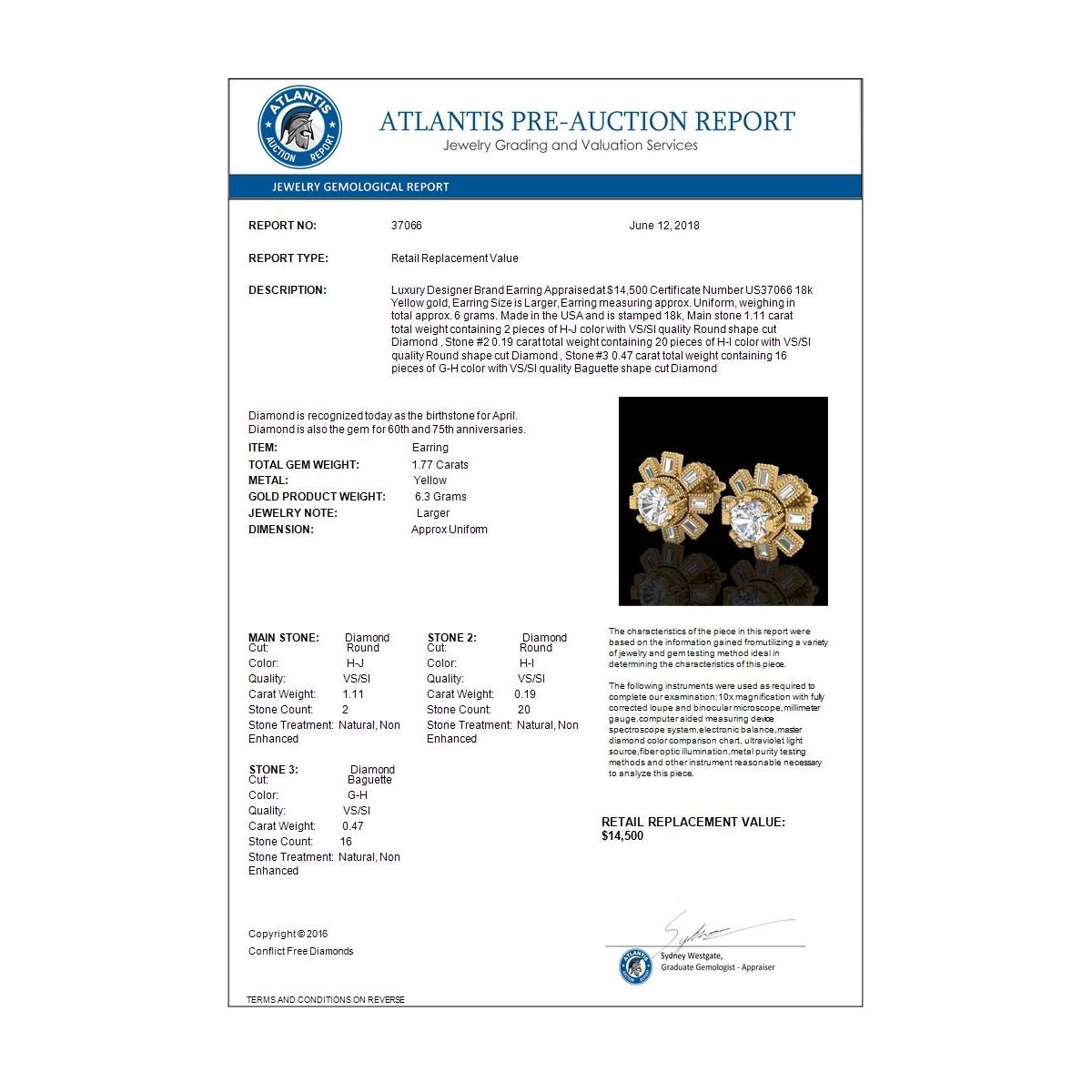 REF-263W6F -37066 ---- 1.77 CTW VS/SI Diamond Solitaire Art Deco Stud Earrings 18K Yellow Gold ---- Luxury Designer Brand Earring Appraised at $14,500 Certificate Number US37066 18k Yellow gold, Earring Size is Larger, Earring measuring approx. Uniform, weighing in total approx. 6 grams. Made in the USA and is stamped 18k, Main stone 1.11 carat total weight containing 2 pieces of H-J color with VS/SI quality Round shape cut Diamond , Stone #2 0.19 carat total weight containing 20 pieces of H-I color with VS/SI quality Round shape cut Diamond , Stone #3 0.47 carat total weight containing 16 pieces of G-H color with VS/SI quality Baguette shape cut Diamond